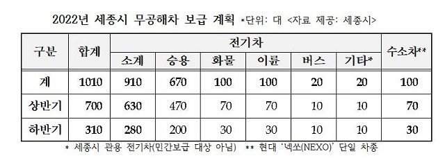 세종시가 13일 발표한 2022년 무공해차 보급 계획에 따르면 올해 보급할 차량은 모두 1010대(전기차 910, 수소차 100)다. 이는 시가 지난해 보급한 657대보다 353대(53.7%) 많은 물량이다.