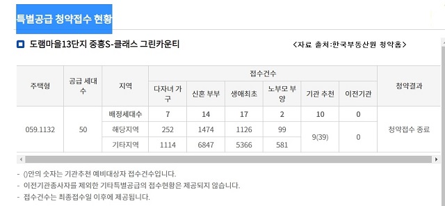 15일 한국부동산원에 따르면 세종 신도시(행복도시) 도담동 도램마을13단지 ‘중흥S클래스 그린카운티’ 70가구(전용면적 59㎡형) 입주자를 모집하는 중흥주택은 15일 일반공급에 앞서 전날 50가구에 대한 특별공급 청약 신청을 받았다.