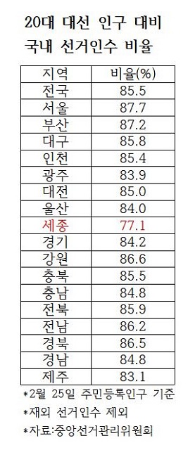 [대선 2022] 세종시 유권자 비율 77.1%...전국 평균보다 8.4%p 낮아