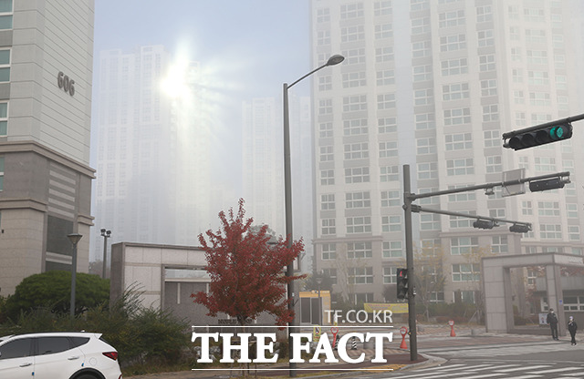[더팩트 | 시흥=우정식 기자] 28일 오전 경기도 시흥시 배곧신도시 아파트 단지에 짙은 안개가 뒤덮고 있는 가운데 한 시민이 출근길을 서두르고 있다.