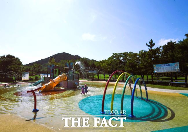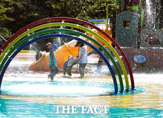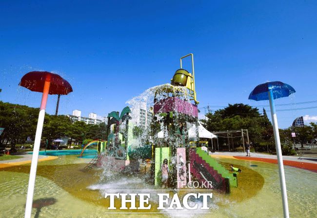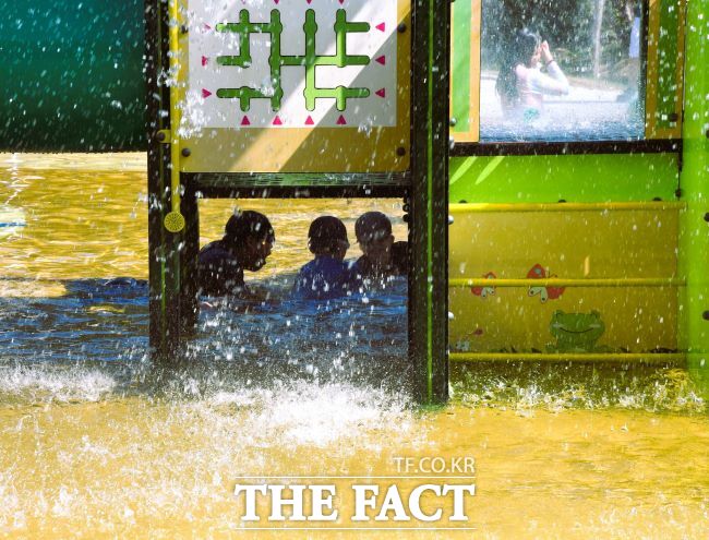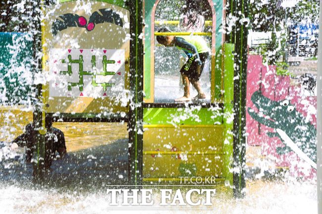 [더팩트|시흥=김동선 기자] 폭포수처럼 시원하게 쏟아지는 물줄기에 여름 더위를 날려버리는 어린이들의 기분 좋은 웃음소리가 경기 시흥시 옥구공원을 가득 메우고 있다.