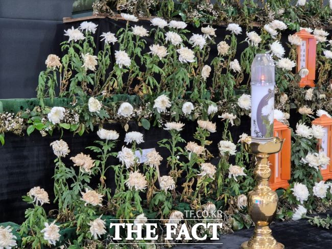 [더팩트ㅣ수원=유명식 기자] 경기도가 아리셀 공장 화재 희생자들을 추모하기 위해 수원 광교청사 내에 설치한 합동분향소의 조화들이 시들어 있다.