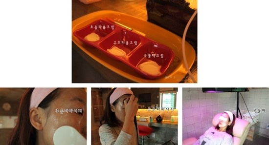 고주파가 끝난 후 자리를 옮겨 곡물팩을 피부에 바른 후 가시광선을 쬐이며 20분 팩을 해 줍니다.