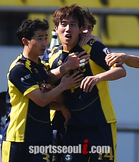 [탄천종합운동장=최용민 기자] 3일 저녁 경기도 성남 탄천종합운동장에서 열린 2014 K리그 클래식 성남FC와 포항스틸러스의 경기에서 성남 정선호가 후반 역전골을 성공 시킨 후 동료들과 기뻐하고 있다.