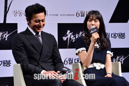 [ 압구정=남윤호 기자]배우 장동건(왼쪽)과 김민희가 8일 오전 서울 강남구 신사동 CGV 압구정점에서 열린 영화 '우는 남자'의 제작발표회에 참석해 취재진의 질문에 답하고 있다.