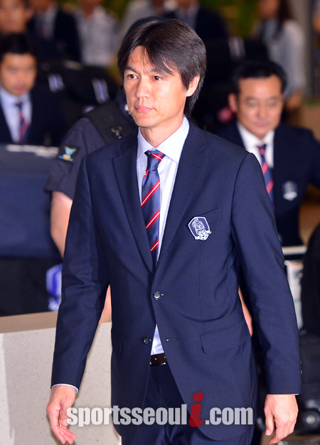 [ 인천국제공항=남윤호 기자]2014 브라질 월드컵에서 16강 진출에 실패한 아쉬운 성적을 기록한 한국 축구 국가대표팀이 30일 오전 귀국한 가운데 인천국제공항 입국장으로 홍명보 감독이 들어서고 있다.