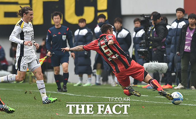 [더팩트 | 서울월드컵경기장=최진석 기자]FC서울의 차두리(오른쪽)가 23일 오후 서울 마포구 서울월드컵경기장에서 열린 FC서울과 성남FC의 '2014 하나은행 FA컵' 결승에서 밖으로 나가는 공을 살려내고 있다.