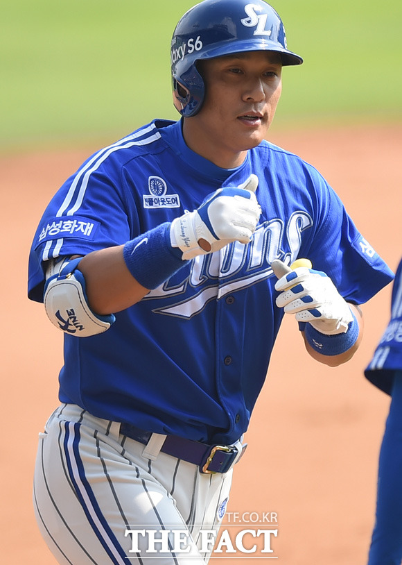 30일 오후 서울 잠실야구장에서 열린 '2015 타이어뱅크 KBO 리그' 삼성라이온즈와 LG트윈스의 경기에서 7회초 선두타자로 나선 삼성 이승엽이 우측담장을 넘기는 솔로 홈런을 터뜨리고 그라운드를 돌고 있다. 이승엽은 KBO리그 통산 400홈런에 단 한 개만을 남겨 뒀다.