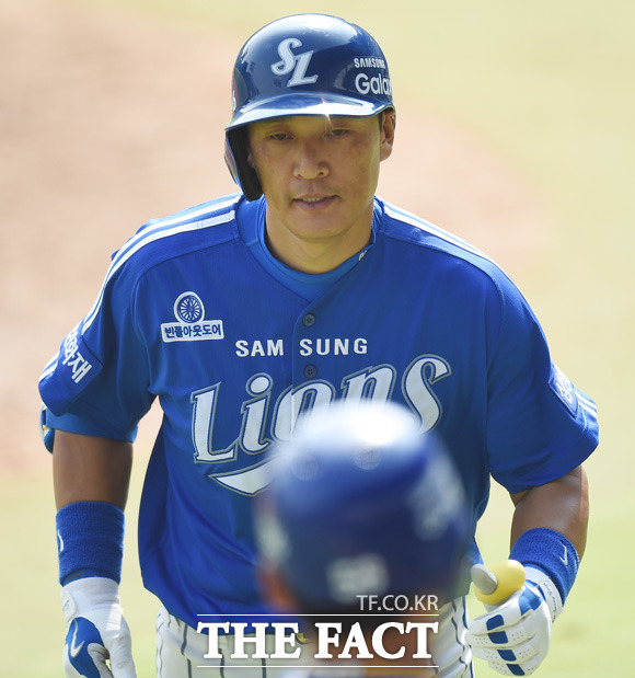 30일 오후 서울 잠실야구장에서 열린 '2015 타이어뱅크 KBO 리그' 삼성라이온즈와 LG트윈스의 경기에서 7회초 선두타자로 나선 삼성 이승엽이 우측담장을 넘기는 솔로 홈런을 터뜨리고 동료들의 환영을 받고 있다. 이승엽은 KBO리그 통산 400홈런에 단 한 개만을 남겨 뒀다.