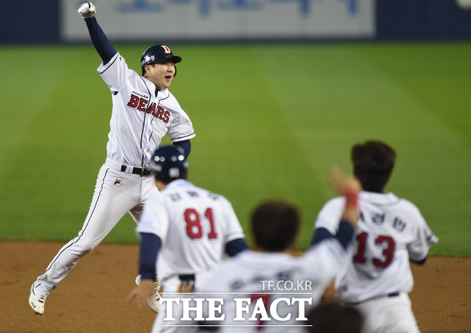 10일 오후 서울 잠실야구장에서 열린 '2015 KBO 리그 포스트시즌 준플레이오프 1차전' 넥센히어로즈와 두산베어스의 경기에서 두산 박건우가 연장 10회말 1사 2루서 극적인 끝내기 안타를 터뜨리고 환호하고 있다.