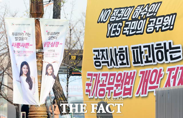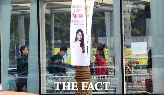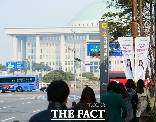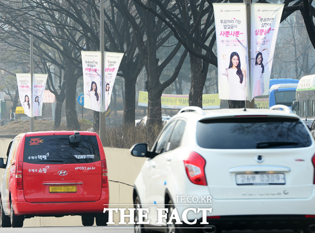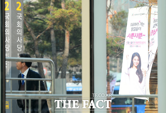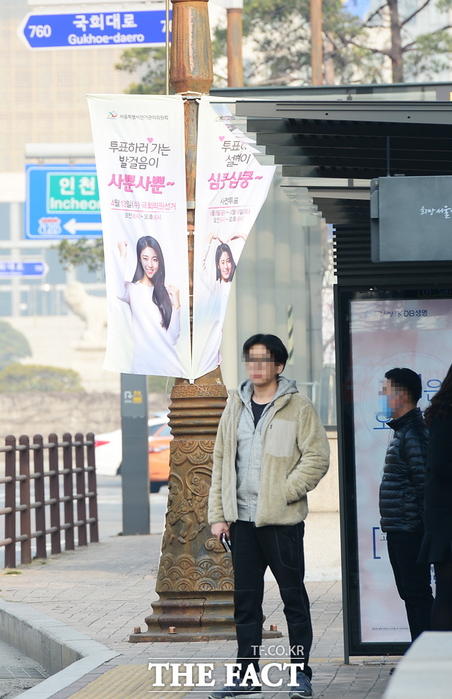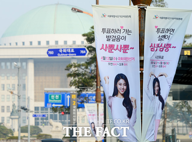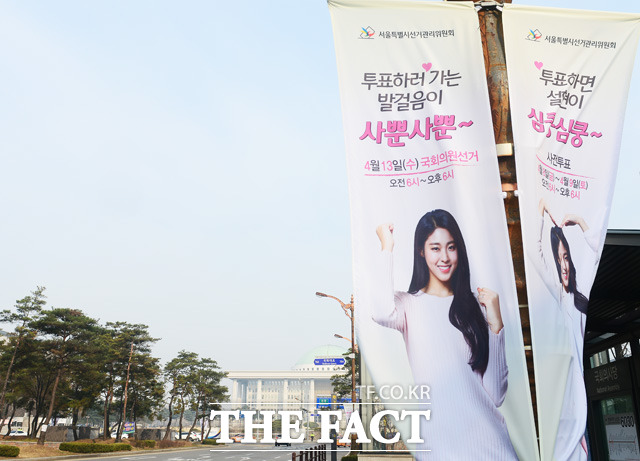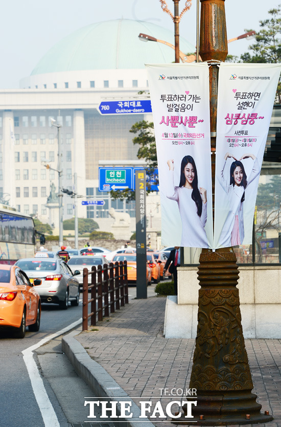 [더팩트 │배정한 기자] 20대 총선을 22일 앞둔 22일 서울 여의도 의사당대로에 걸그룹 AOA 설현을 모델로 제작된 선거 홍보 현수막이 걸려 있다. 설현은 4월 13일에 열리는 제20대 국회의원선거의 '아름다운 선거 홍보대사'로 위촉되어 TV 광고 및 각종 홍보물 등에 모델로 활약하고 있다.