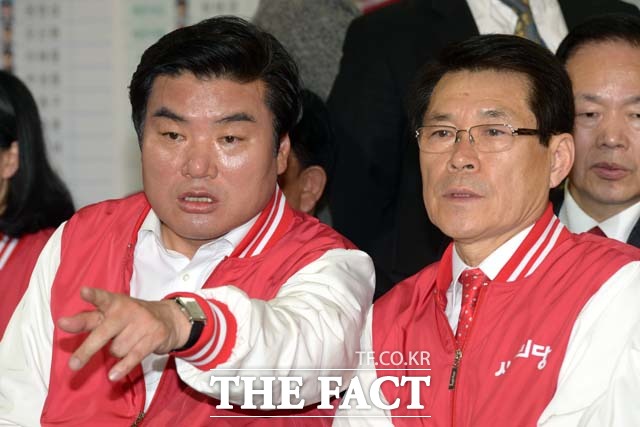 [더팩트│임영무 기자]강봉균 새누리당 공동선대위원장과 원유철 공동선대위원장이 제20대 총선 투표가 종료된 13일 저녁 서울 여의도 새누리당사에서 출구 초사를 지켜보며 예상치보다 낮은 출구 조사 결과에 어두운 표정을 감추지 못했다.