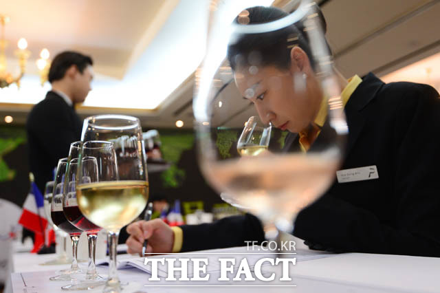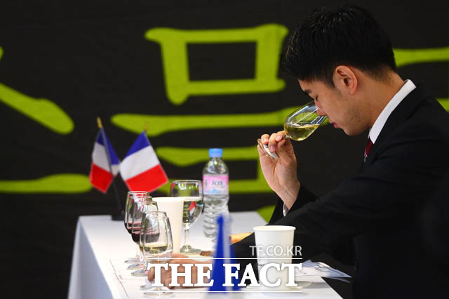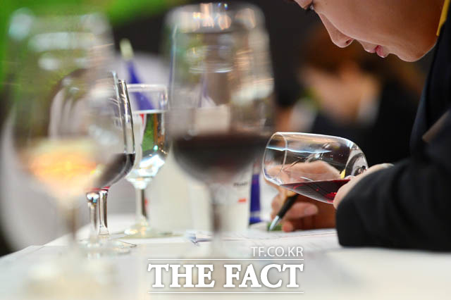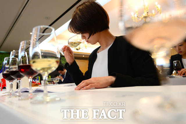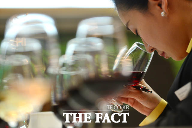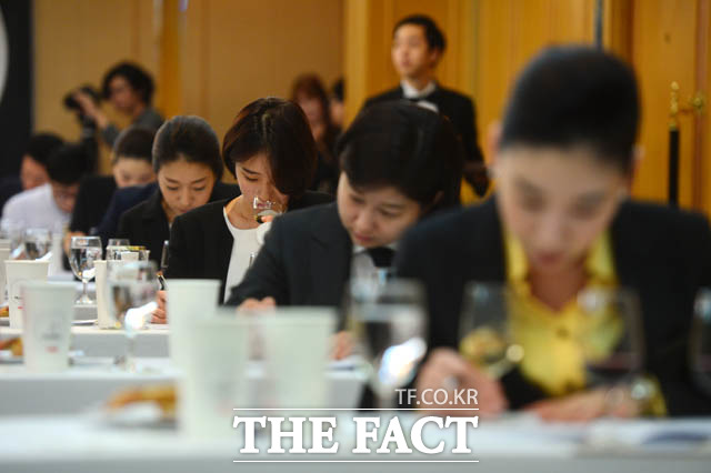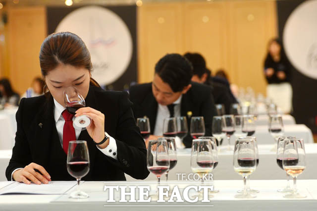 [더팩트 | 남윤호 기자] 19일 오전 서울 강남구 논현동 임피리얼 팰리스 서울 호텔에서 열린 제15회 한국 소믈리에 대회 2차 예선 참가자가 와인의 향을 맡고 있다.