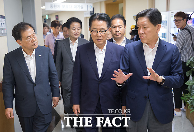 [더팩트ㅣ이새롬 기자] 박지원 국민의당 비상대책위원장(왼쪽)이 동료 의원들과 함께 2일 오후 서울 종로구 서울대학교병원 중환자실을 찾아 지난해 민중총궐기 당시 경찰의 물대포를 맞고 중태에 빠진 백남기 농민을 위로 방문한 뒤, 부인 박경숙 씨를 위로하고 있다.