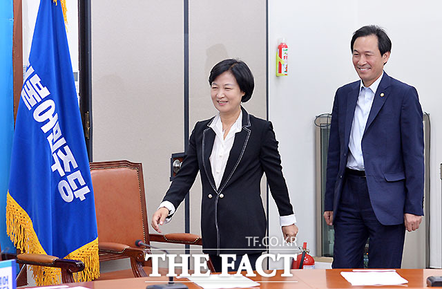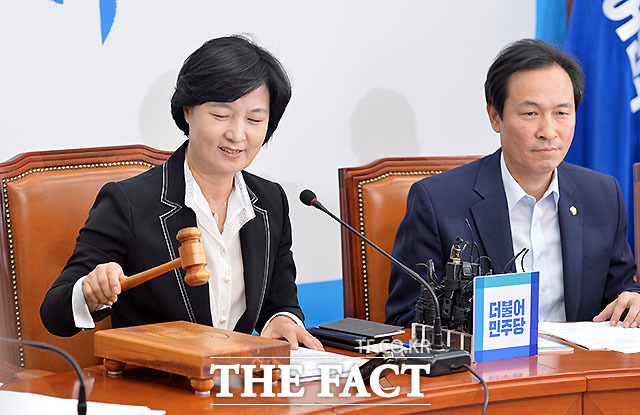 [더팩트ㅣ국회=문병희 기자] 추미애 더불어민주당 신임 당대표(왼쪽에서 세 번째)가 29일 오전 서울 여의도 국회에서 가진 최고위원회에 앞서 신임 지도부와 손을 맞잡고 있다. 왼쪽부터 전해철, 김영주 최고위원, 추 대표, 우상호 원내대표, 송현섭, 양향자 최고위원.