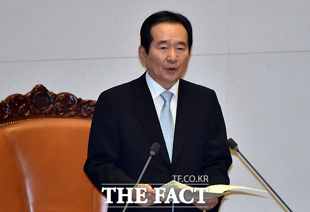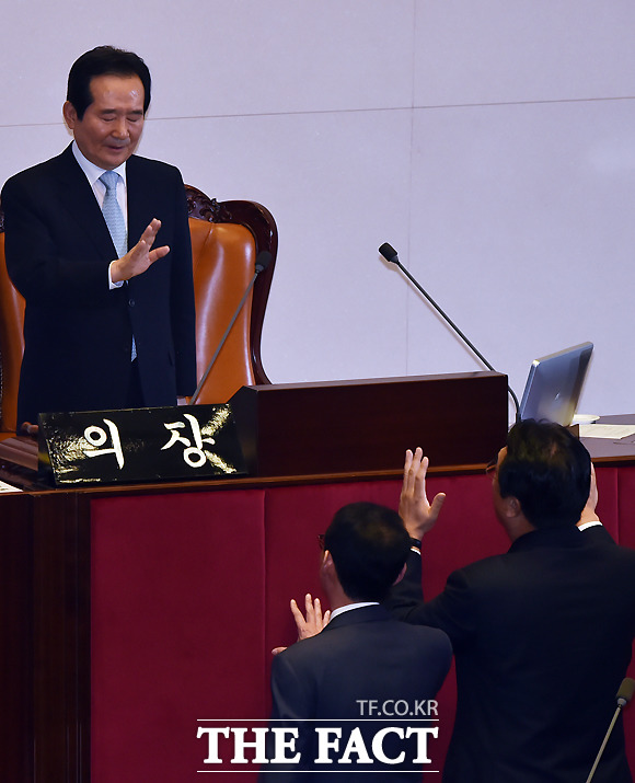 정 의장은 이날 국회 개회사에서 "쓴 소리 좀 하겠다. 제 개인의 목소리가 아닌 국민의 목소리라 생각하고 들어주시기 바란다"며 우병우 청와대 수석과 사드 문제에 대해 언급했고, 이에 이정현 대표를 비롯한 일부 새누리당 의원들은 정 의장 발언에 항의하며 본회의장을 떠났다.