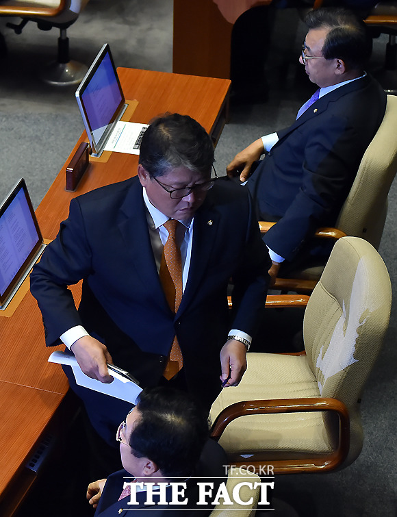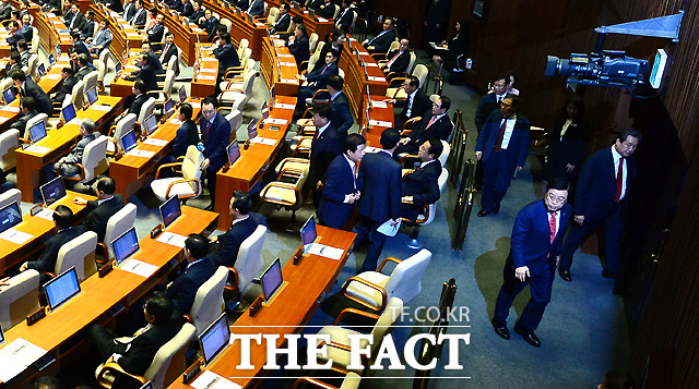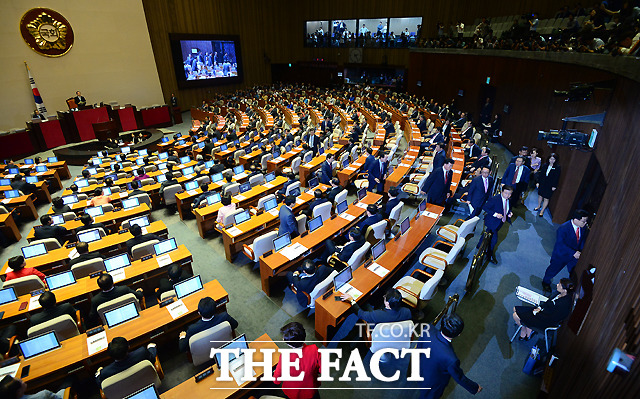 [더팩트ㅣ국회=이새롬 기자] 정기 국회 개회식이 열린 1일 오후 서울 여의도 국회 본회의장에서 새누리당 일부 의원들이 정세균 국회의장의 개회사에 대해 항의하며 본회의장을 떠나고 있다.