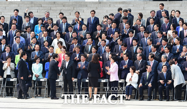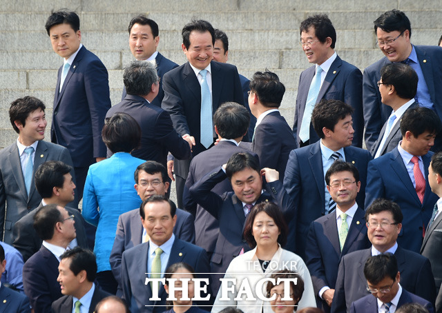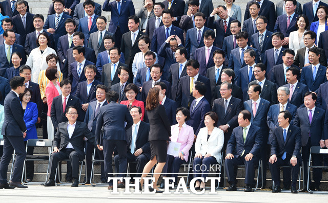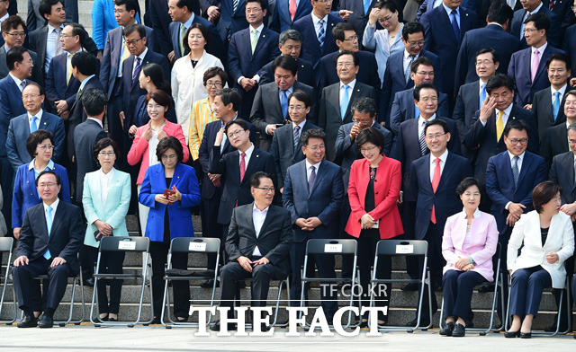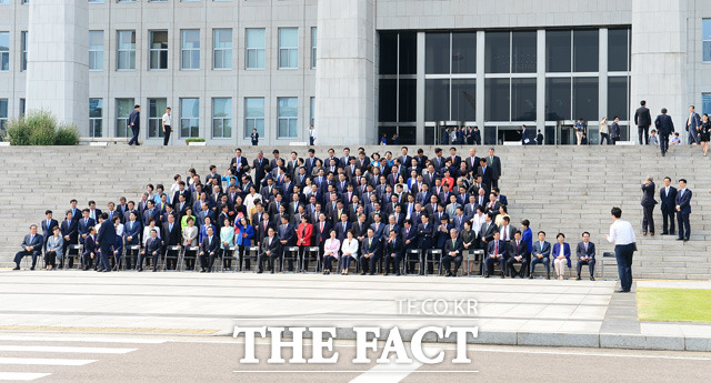 [더팩트ㅣ국회=배정한 기자] 20대 국회 국회의원 단체기념사진 촬영이 1일 서울 여의도 국회의사당에서 열린 가운데 정세균 국회의장 개회사에 불만을 표출한 새누리당 의원들이 참석하지 않고 있다.