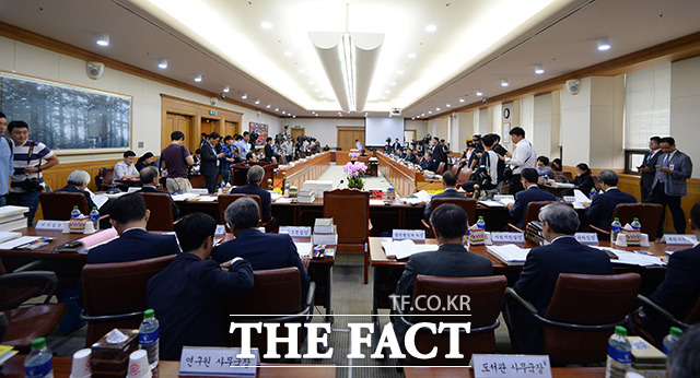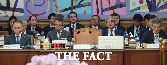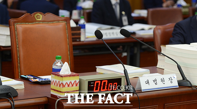 [더팩트ㅣ이덕인 기자] 20대 국회 첫 국정감사가 시작된 26일 오전 서울 서초구 대법원 대회의실에서 열린 법사위원회의 대법원에 대한 국정감사가 여당인 새누리당 불참으로 시작도 못한 가운데 노회찬 정의당 의원(왼쪽)을 비롯한 야당 의원들이 국정감사장을 나가고 있다. 국회가 김재수 농림축산식품부 장관 해임건의안 야당 단독 처리로 국회 일정을 보이콧하면서 여당인 새누리당 의원들은 이날 국정감사에 참석하지 않고 있다.