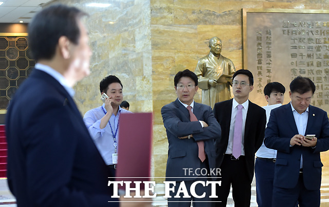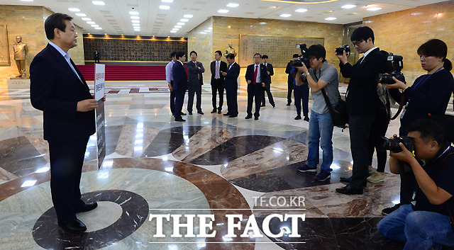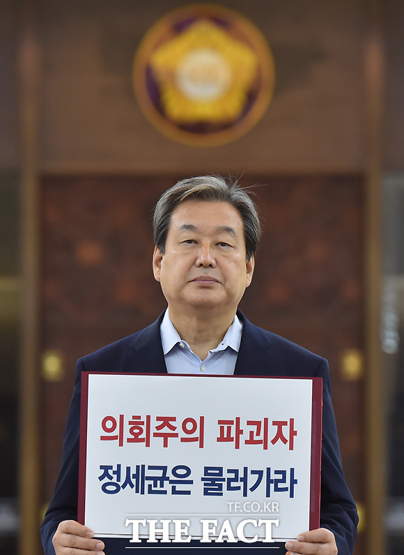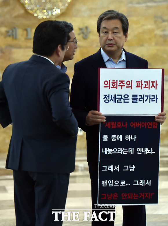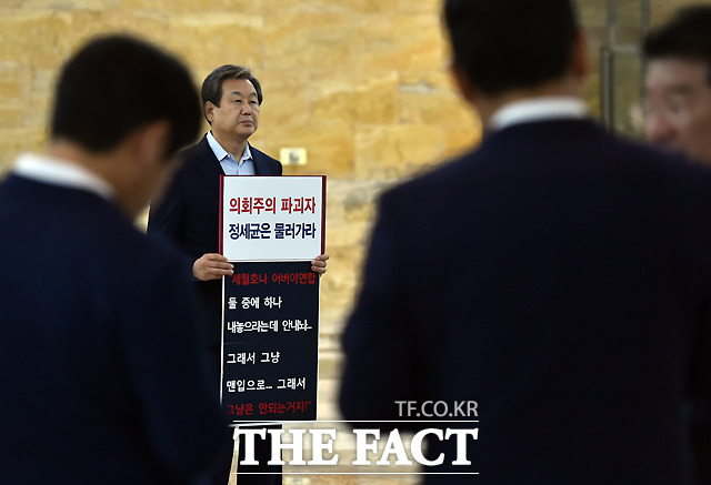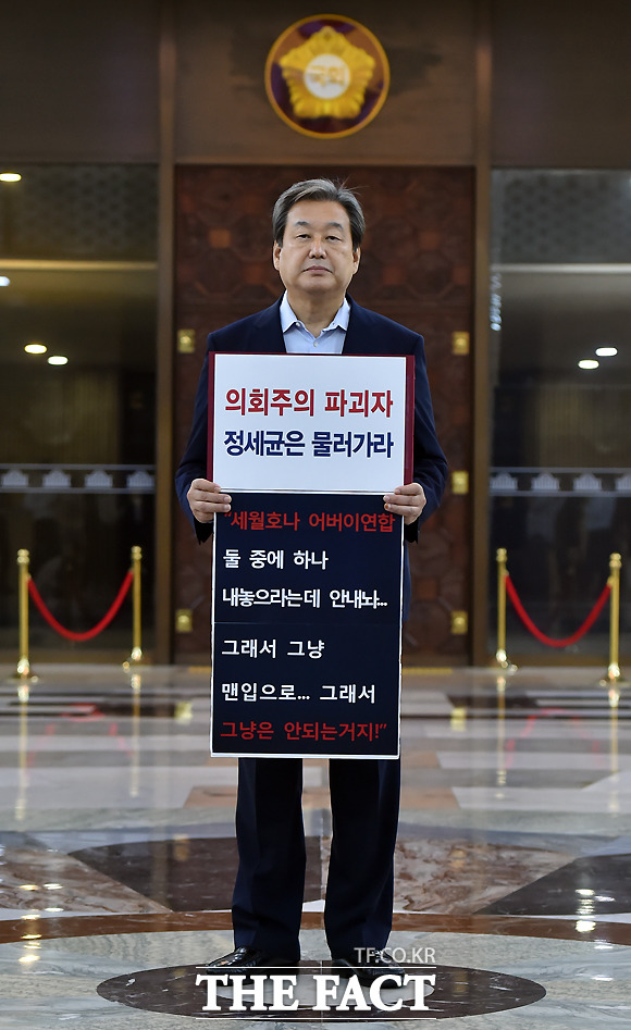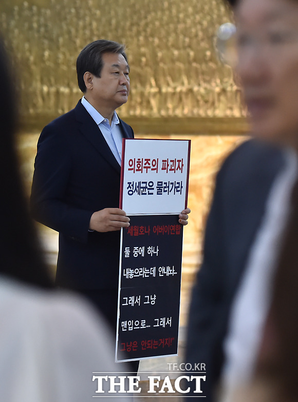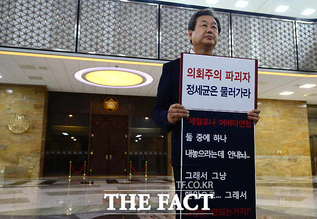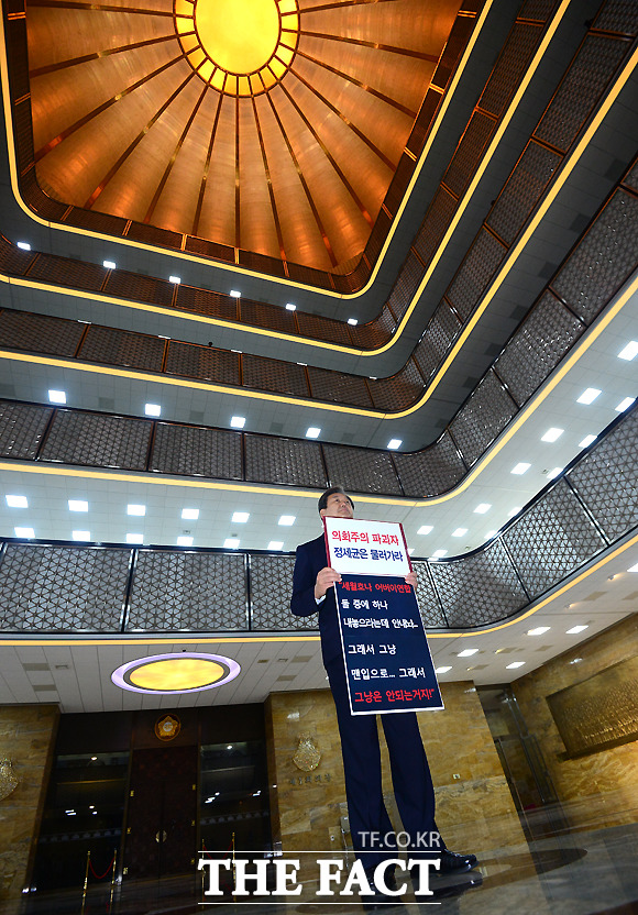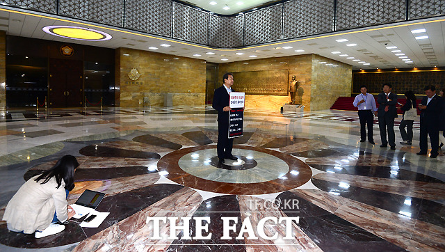 [더팩트ㅣ국회=이새롬 기자] 김무성 새누리당 의원이 26일 서울 여의도 국회 본회의장 앞에서 정세균 국회의장의 사퇴를 요구하며 1인 시위를 하고 있다. 앞서 이정현 새누리당 대표는 이날 국회서 열린 긴급 의원총회에서 정 의장이 사퇴할 때까지 단식 농성을 하겠다고 선언했으며, 새누리당은 김무성 전 대표를 필두로 중진의원, 최고위원 등이 선수가 많은 순부터 하루 1~2시간씩 국회에서 1인 시위에 돌입하기로 했다.