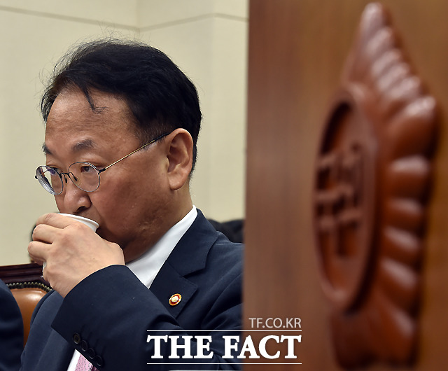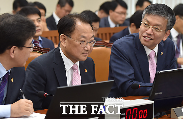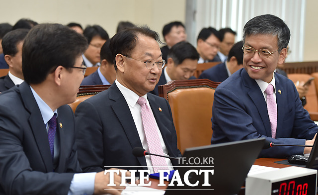 [더팩트ㅣ국회=이새롬 기자] 유일호 경제부총리가 28일 오전 서울 여의도 국회에서 열린 기획재정부 국정감사에 출석해 차관들과 대화를 나누고 있다.