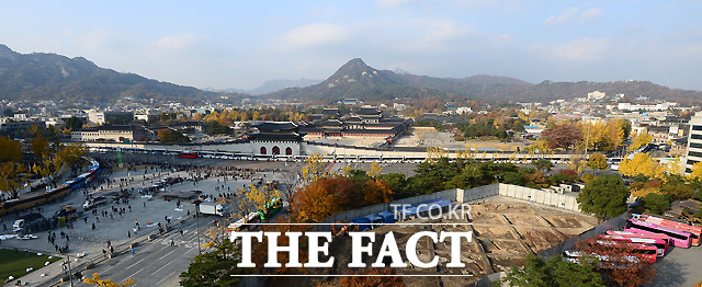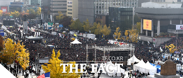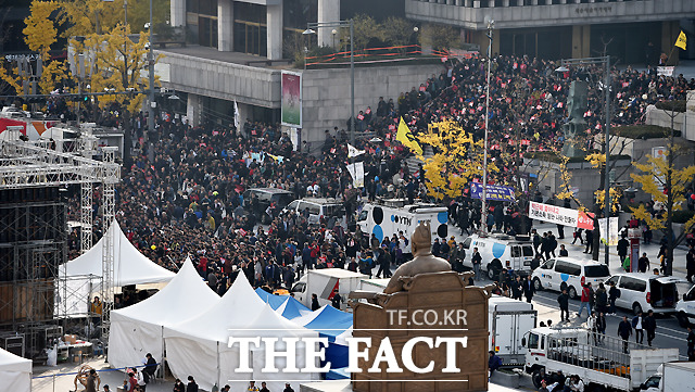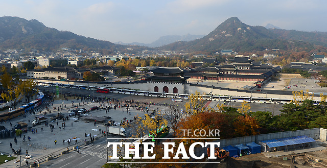[더팩트ㅣ이새롬 기자] '2016 민중총궐기대회'를 앞둔 12일 오후 서울 광화문 광장 일대에 차량이 통제된 가운데 경찰 진압버스들이 길게 차벽을 이루고 있다.