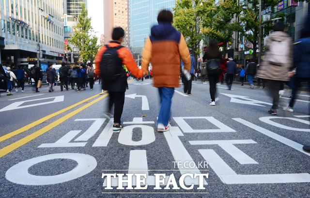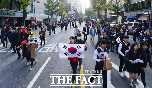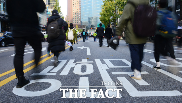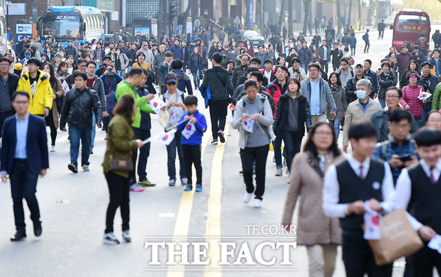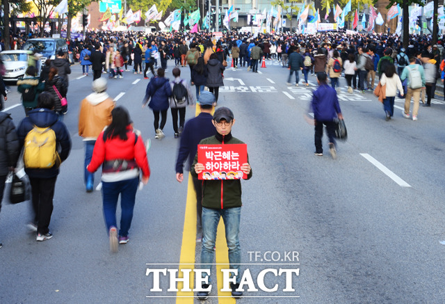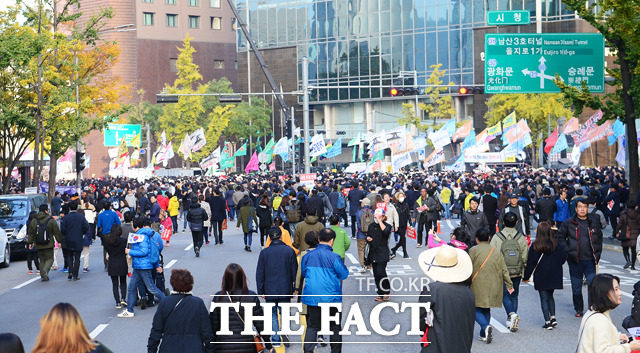 [더팩트ㅣ배정한 기자] '2016 민중총궐기대회'를 앞둔 12일 오후 집회에 참가하기 위한 국민들이 서울 광화문 광장으로 이동하기 위해 차량이 통제된 도로를 걷고 있다.