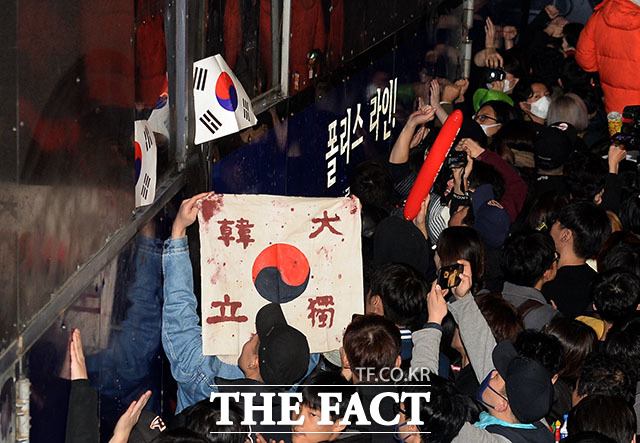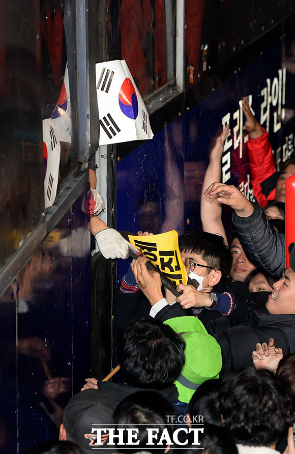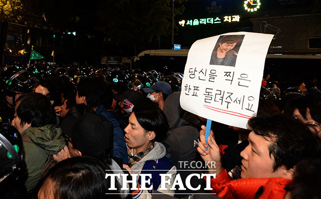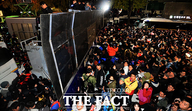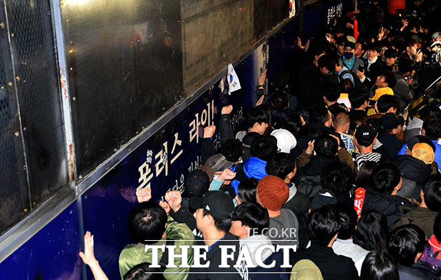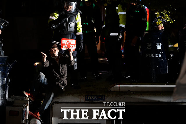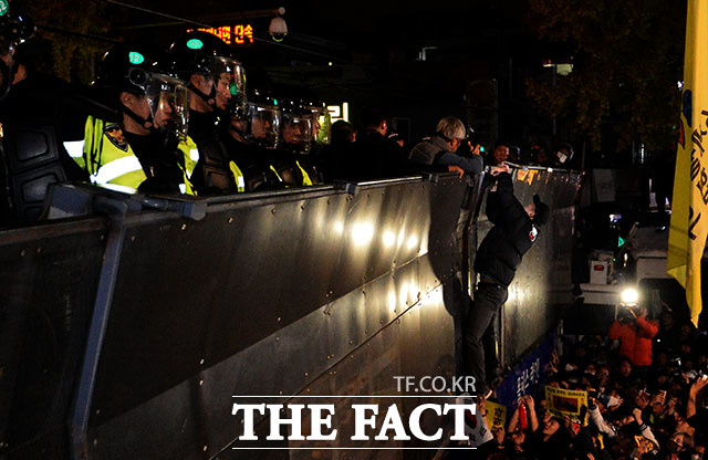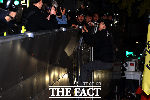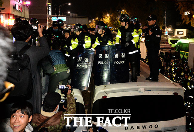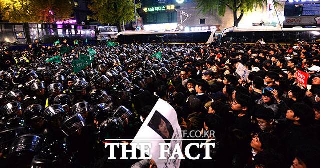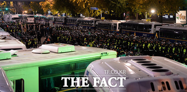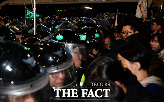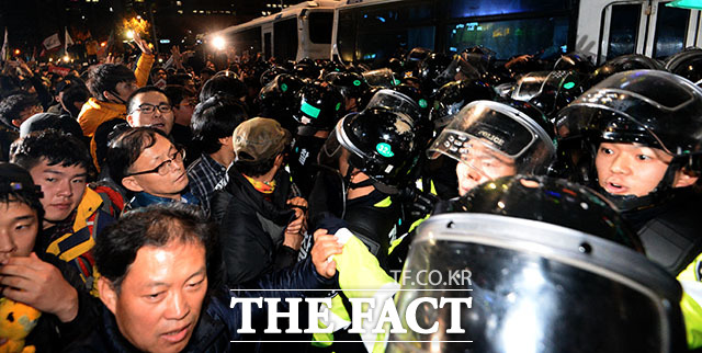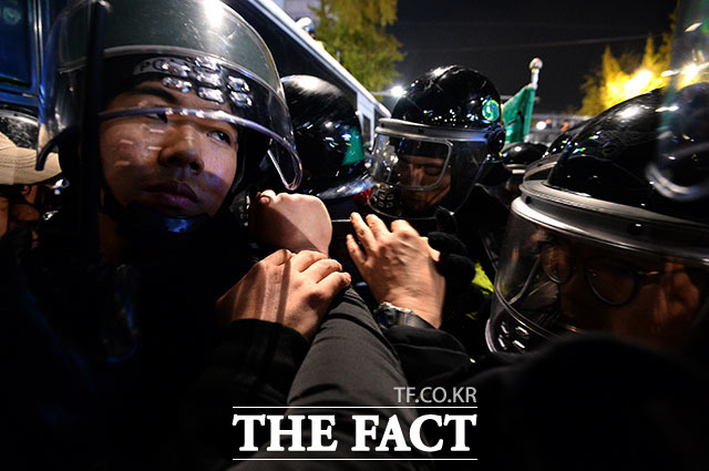 [더팩트ㅣ임세준 인턴기자] 박근혜 대통령 퇴진을 촉구하는 '2016 민중총궐기'가 12일 오후 서울 중구 세종대로 일대에서 열린 가운데 촛불 집회에 참가했던 시민들이 청와대 인근에서 경찰이 설치한 폴리스라인에 막혀 대치하고 있다.