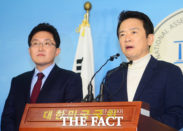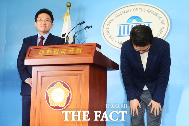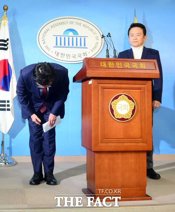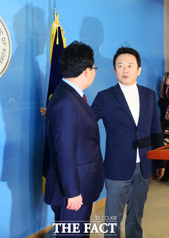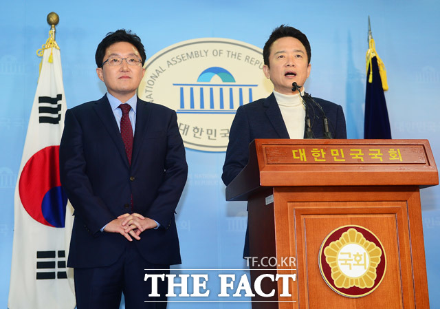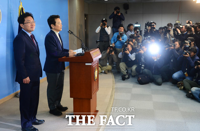 [더팩트ㅣ국회=배정한 기자]남경필 경기지사(오른쪽)와 김용태 새누리당 의원이 22일 오전 서울 여의도 국회의사당 정론관에서 기자회견을 열고 탈당 의사를 밝히고 있다.