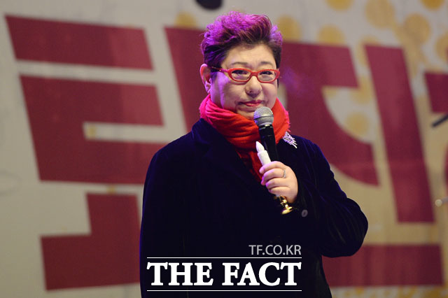 [더팩트ㅣ남용희 인턴기자] 박근혜 대통령의 퇴진을 요구하는 5차 촛불집회가 26일 오후 서울 광화문 광장에서 열린 가운데 가수 양희은이 행복의 나라로를 부르며 미소짓고 있다.