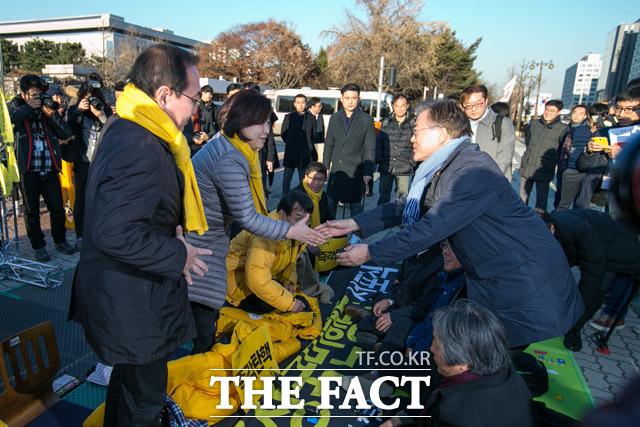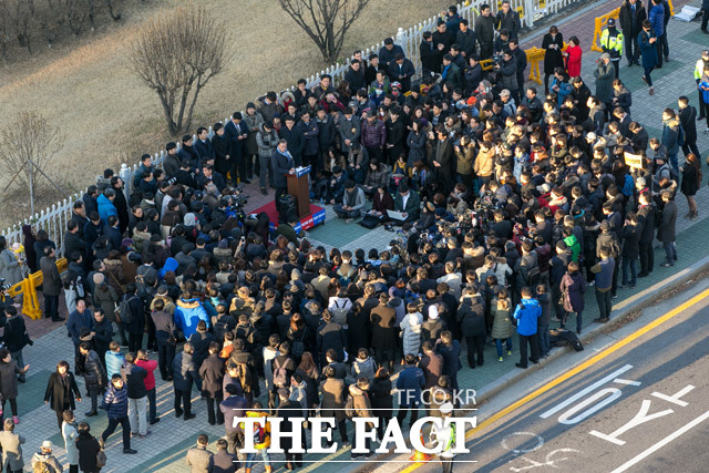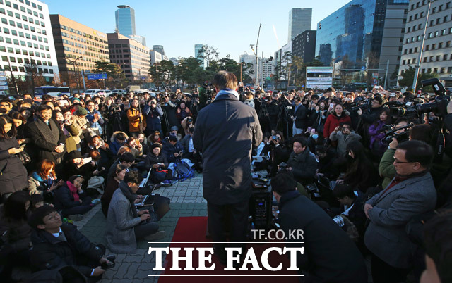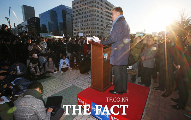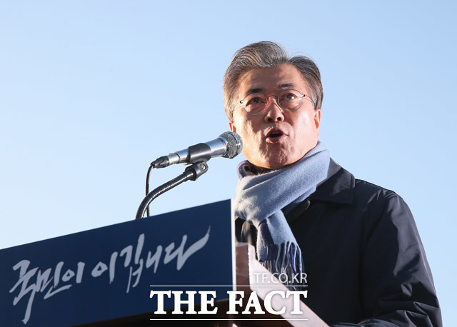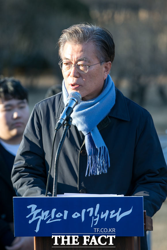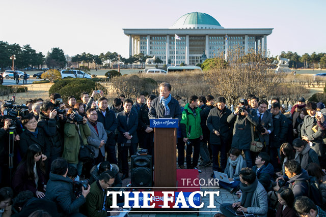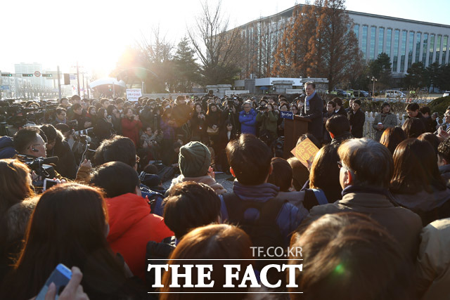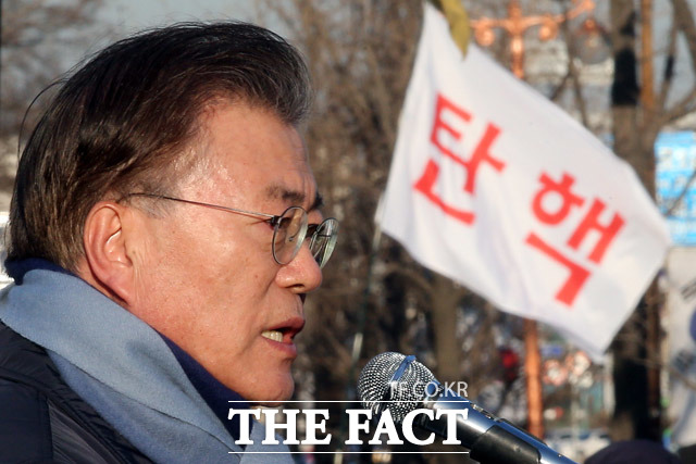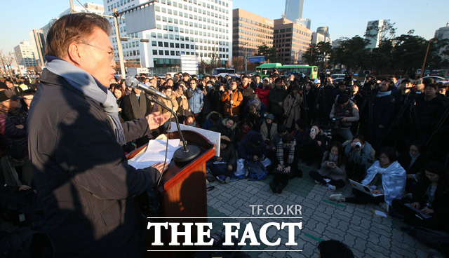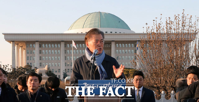 [더팩트ㅣ국회=배정한 기자] 문재인 전 더불어민주당 대표가 2일 오후 서울 여의도 국회의사당 정문 앞에서 '국민이 이깁니다' 현장 연설을 하고 있다. 이날 문 전 대표는 "박근혜 대통령과 최순실 일당이 국정을 농단하고 나라를 흔들고 있다. 사건의 몸통은 박 대통령이고, 공범은 새누리당"이라며 반드시 탄핵해야 한다"고 주장했다.
