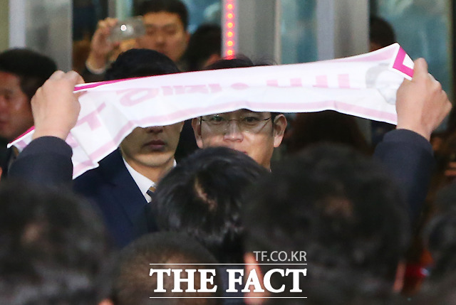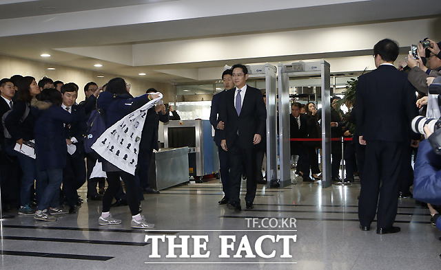 [더팩트ㅣ국회=사진공동취재단] 이재용 삼성전자 부회장이 6일 오전 서울 여의도 국회에서 예정된 '박근혜 정부의 최순실 등 민간인에 의한 국정농단 의혹 사건 진상 규명을 위한 국정조사 특별위원회' 청문회 출석을 위해 국회 본청으로 들어서는 가운데, 노동자들이 기습시위를 벌이고 있다.