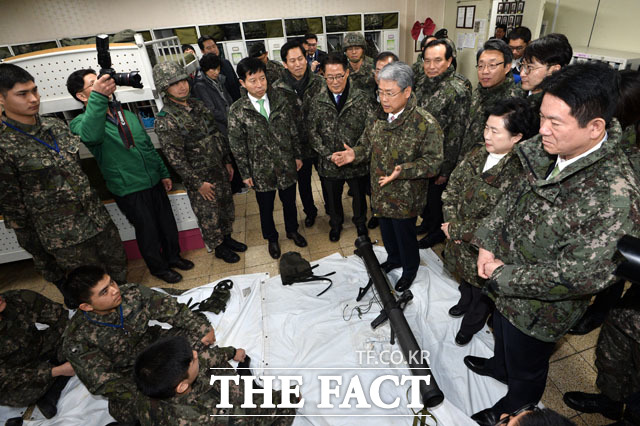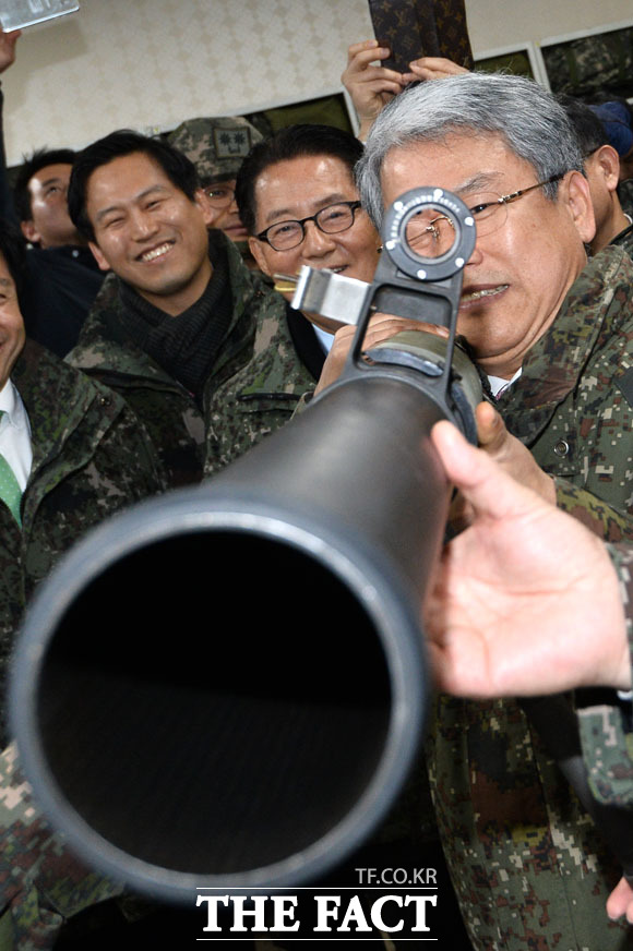 [더팩트 | 파주=남윤호 기자] 국민의당 김동철 비상대책위원장(가운데)과 박지원 원내대표(왼쪽에서 세번째)를 비롯한 지도부가 12일 오전 경기도 파주시 탄현면 백마부대를 방문해 105미리 무반동 화기를 들어보고 있다.