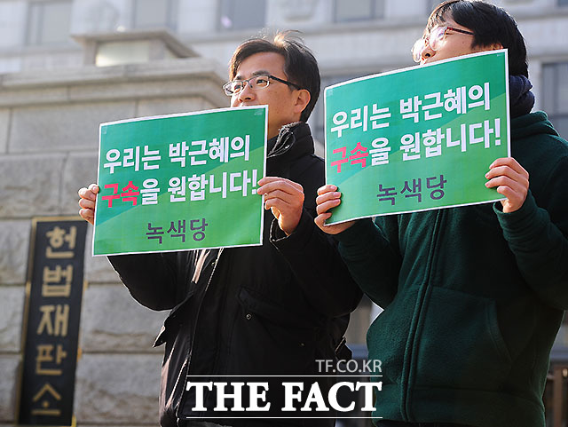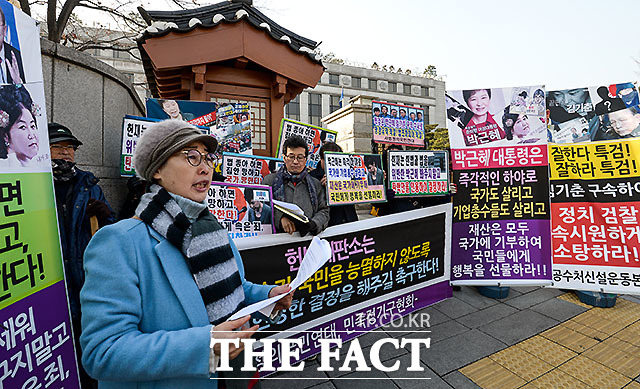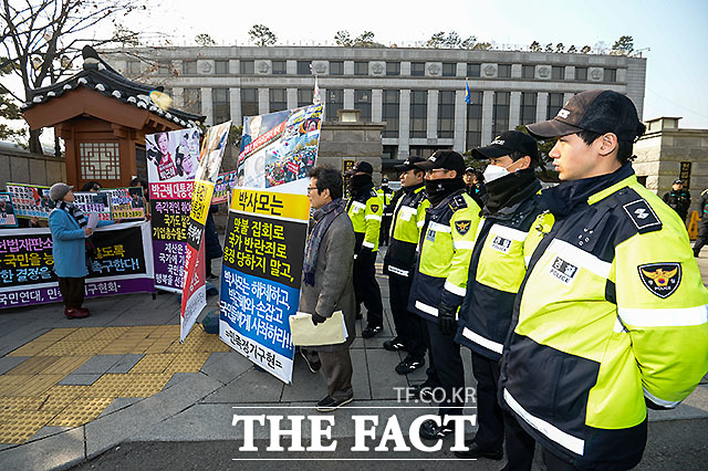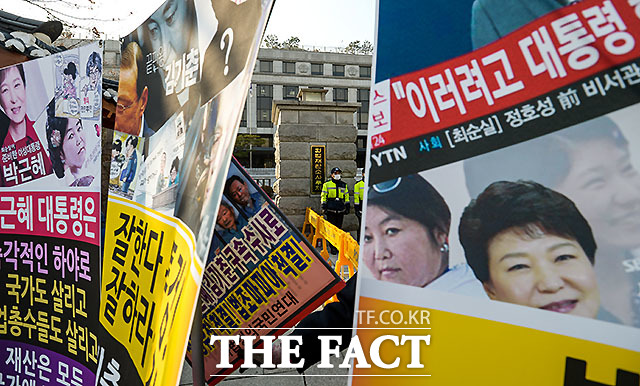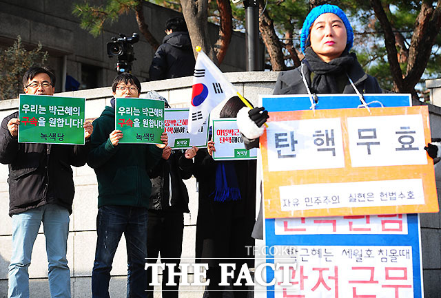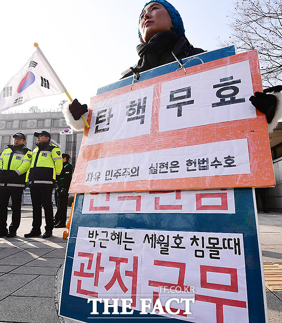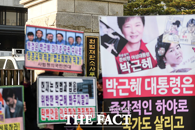 [더팩트ㅣ문병희 기자] 박근혜 대통령 탄핵심판 첫 변론기일이 3일 오후 서울 종로구 헌법재판소 대심판정에서 열린 가운데 헌법재판소 입구에서 시민들이 탄핵 찬반 시위를 하고 있다.