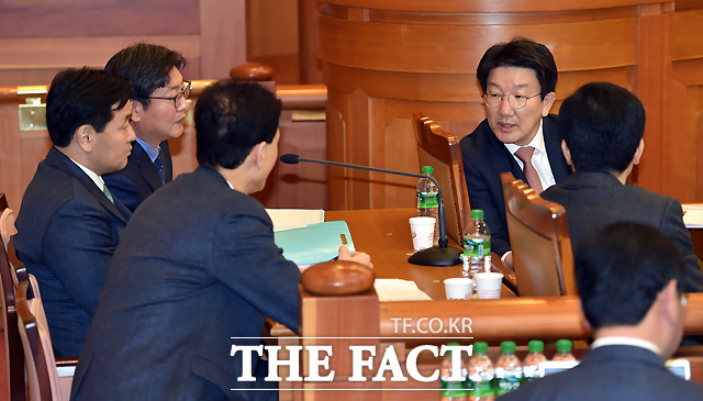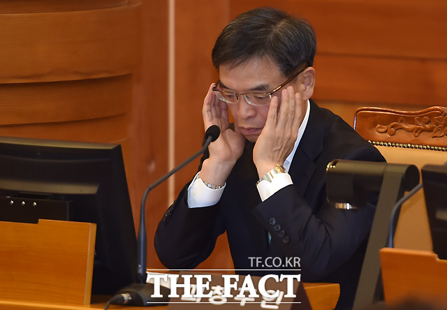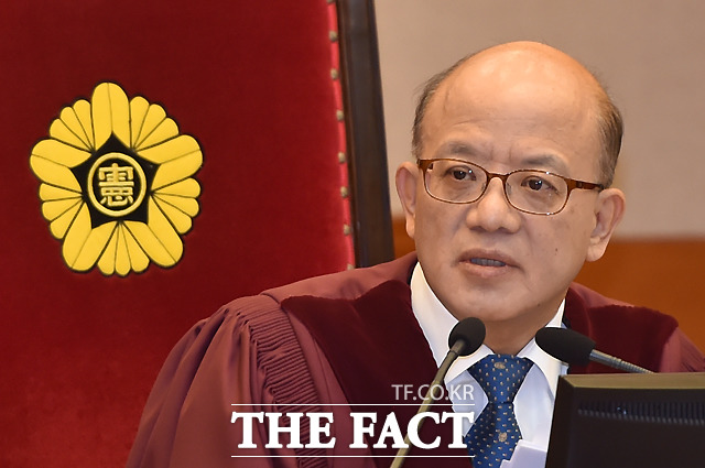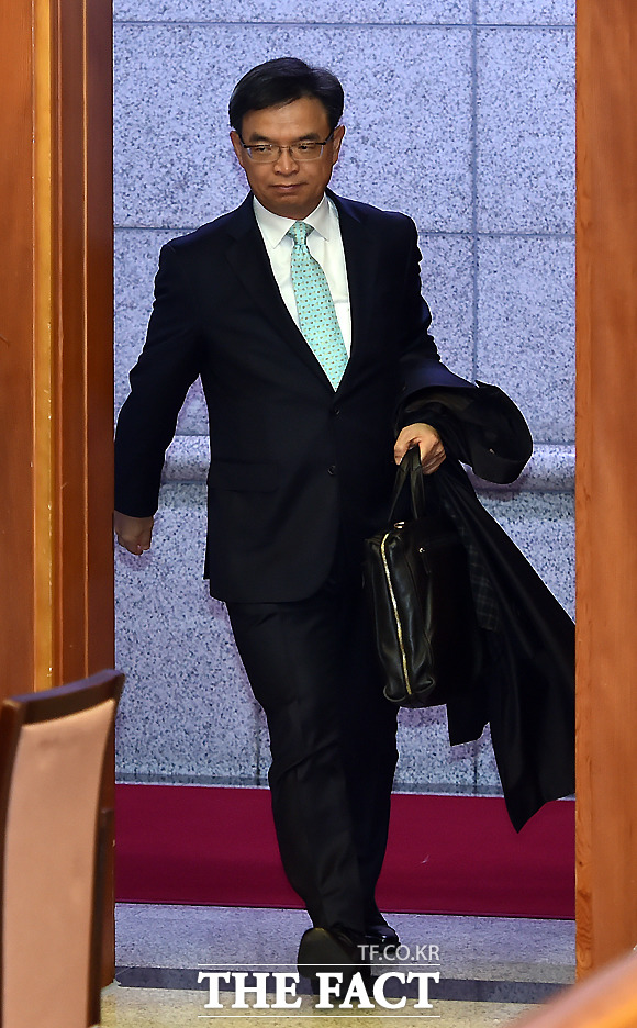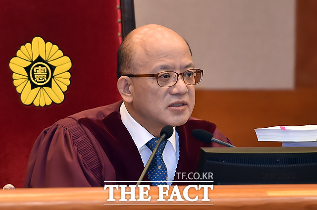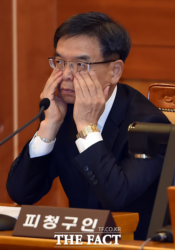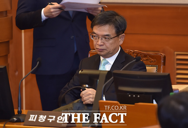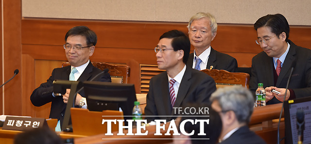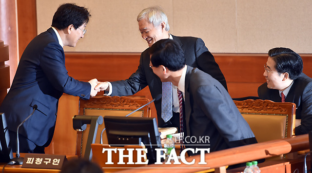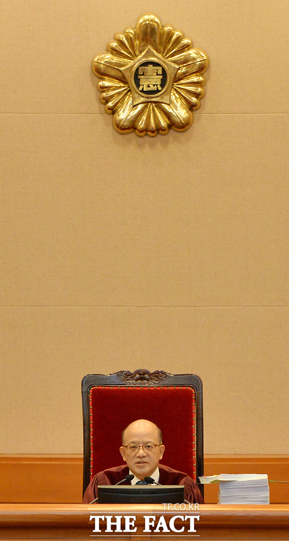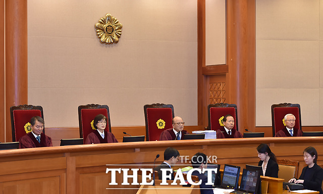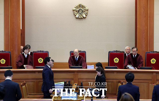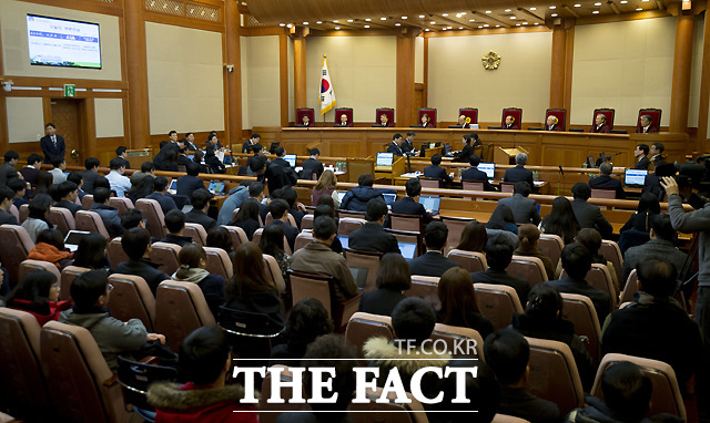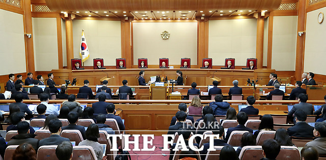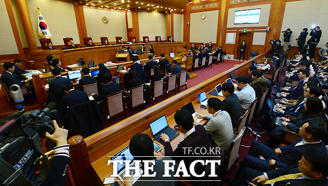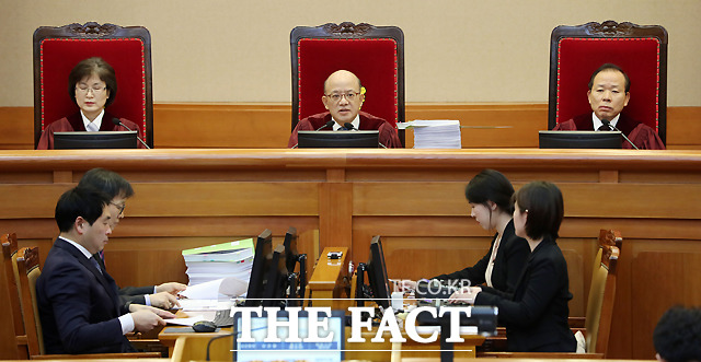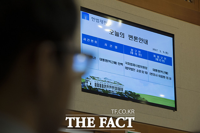 [더팩트ㅣ이새롬 기자] 박근혜 대통령 탄핵심판 제2차 변론기일인 5일 서울 종로구 재동 헌법재판소 대심판정에서 박한철 헌법재판소장(가운데)이 출석한 대리인을 확인하고 있다.