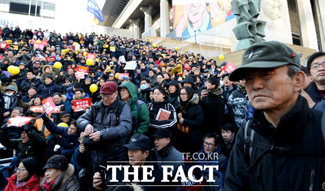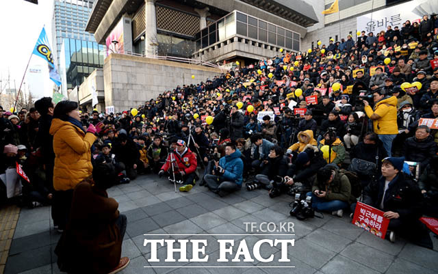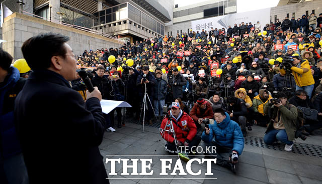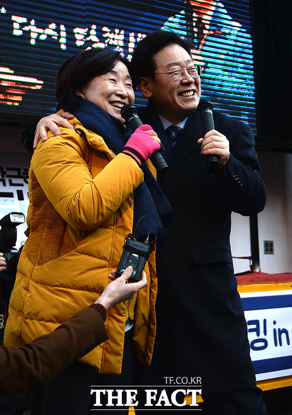[더팩트ㅣ임세준 기자] 심상정 정의당 대표(왼쪽)와 이재명 성남시장이 11일 오후 서울 종로구 세종문화회관 앞에서 열린 '심상정-이재명 탄핵버스킹 in 광화문'에 참석하고 있다.