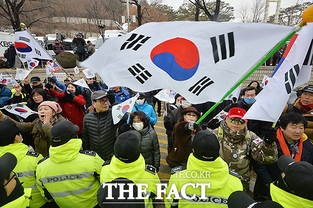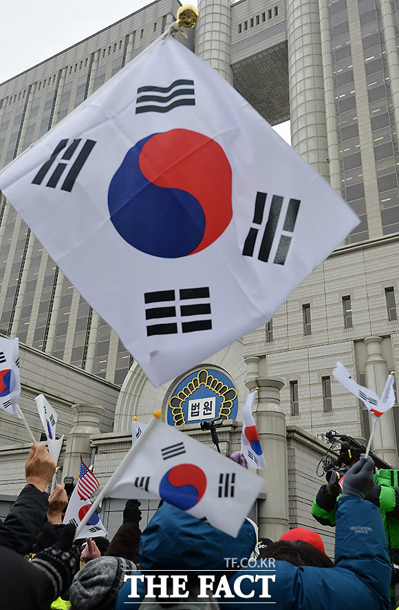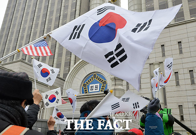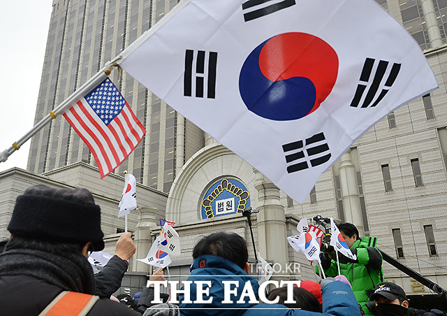 [더팩트ㅣ문병희 기자] 뇌물공여 혐의 등으로 구속영장이 청구된 이재용 삼성전자 부회장의 영장실질심사가 열리는 16일 오전 서울 서초동 서울중앙지방법원에서 시민들이 태극기를 들고 이 부회장 영장 기각을 촉구하고 있다.