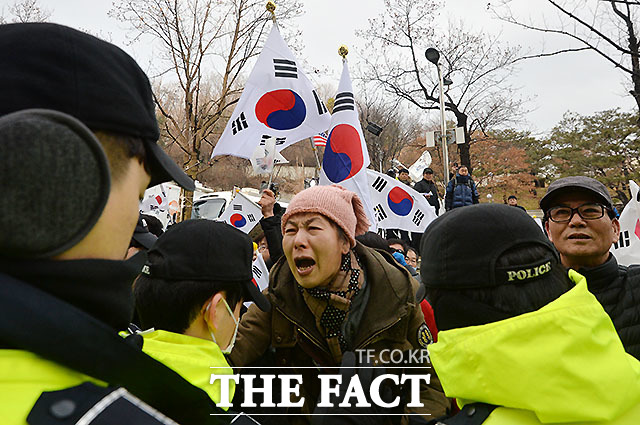[TF포토] '이재용 영장 기각 주장'…법원서 구호 외치는 '태극기 부대'