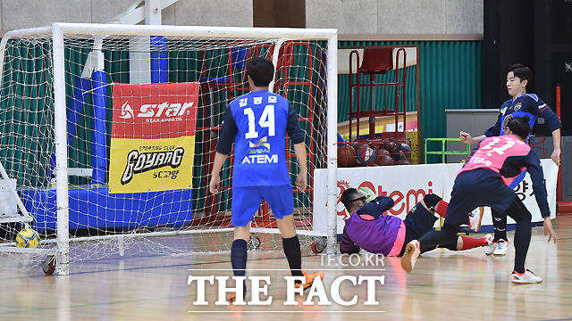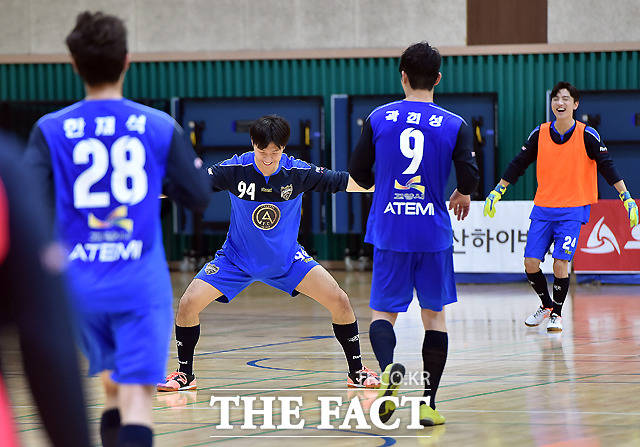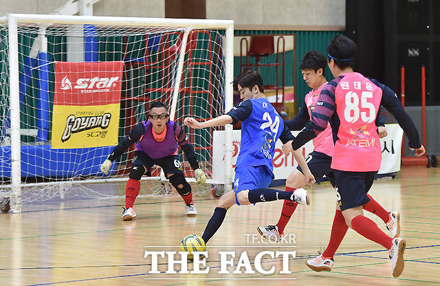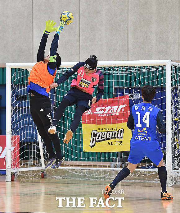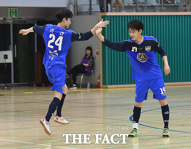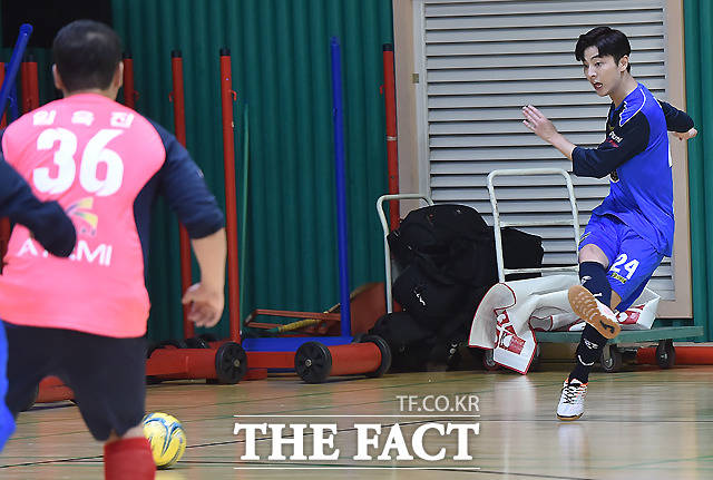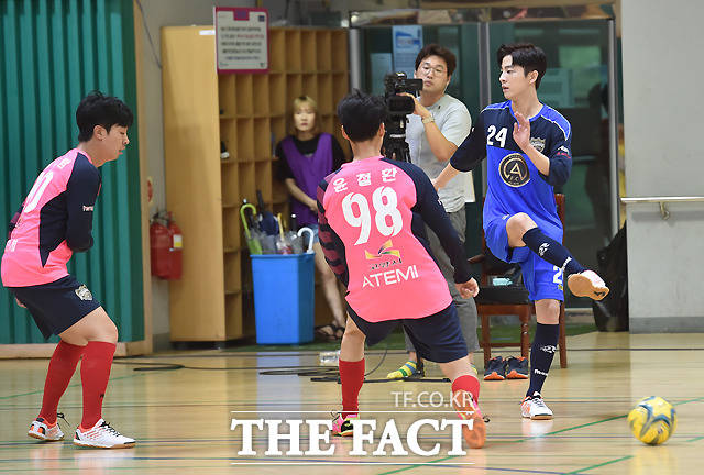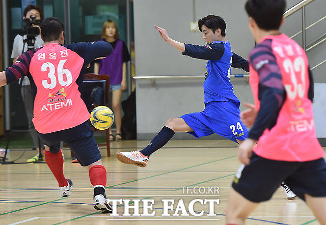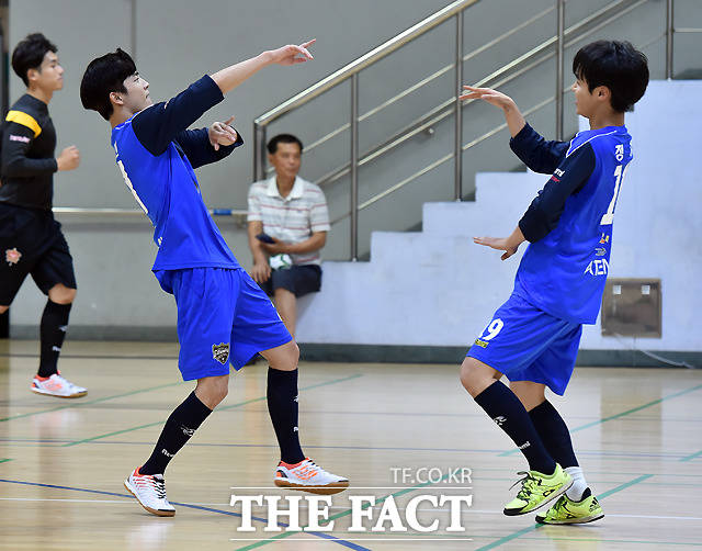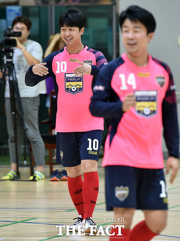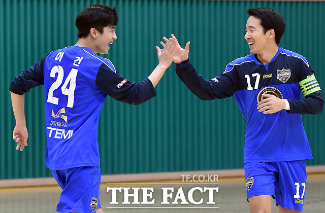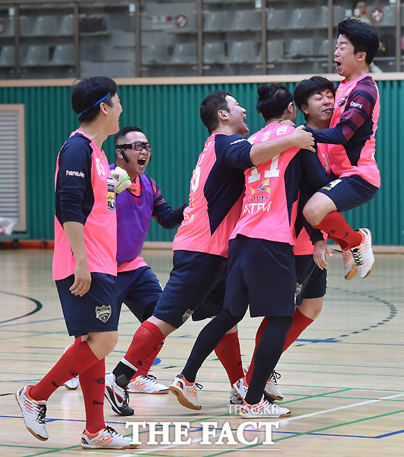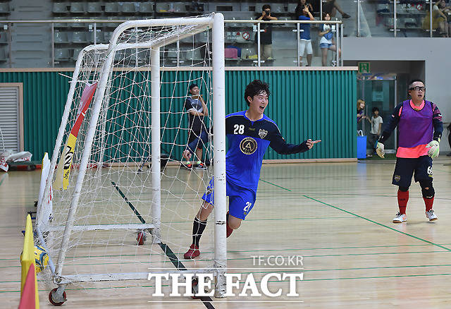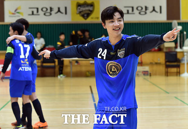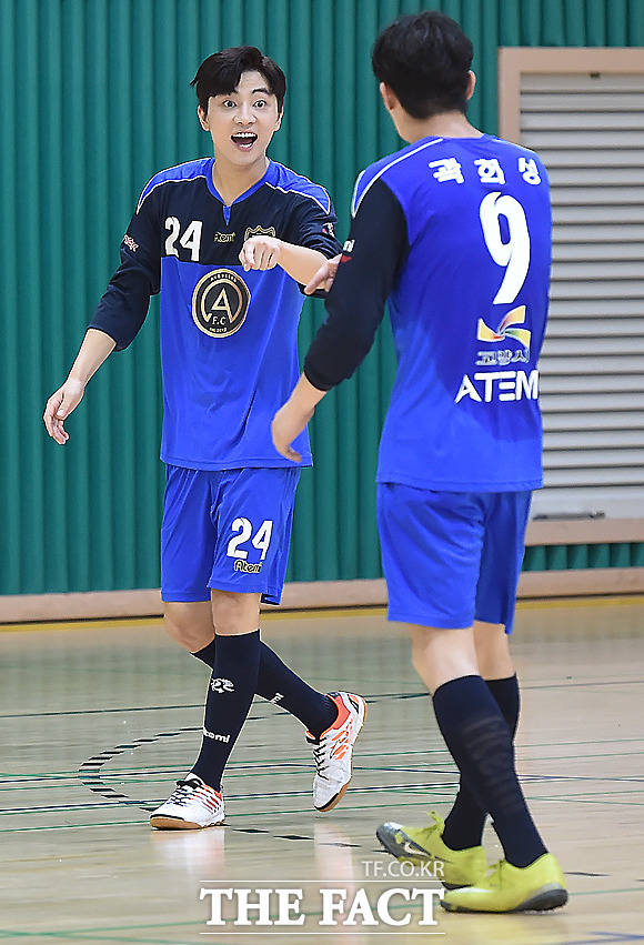 [더팩트ㅣ고양=이새롬 기자] 스타스포츠배 제2회 고양·한스타 연예인 풋살대회가 예선 2차전이 13일 경기도 고양시 어울림누리 스포츠센터에서 열려 FC행주-FC어벤저스 경기가 진행되고 있다. 이날 경기는 1대5로 FC어벤저스가 승리했다. 사진은 골을 넣고 기뻐하는 FC어벤저스의 이건.