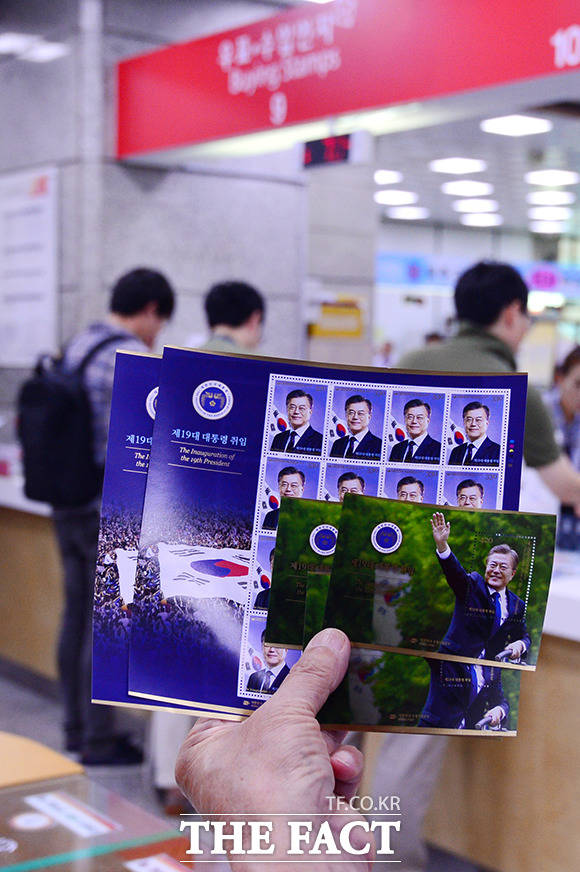 [더팩트ㅣ남용희 기자] 문재인 대통령 취임 100일인 17일 오전 서울 중구 광화문 우체국에서 시민들이 문 대통령 취임 기념 우표를 구입하고 있다.