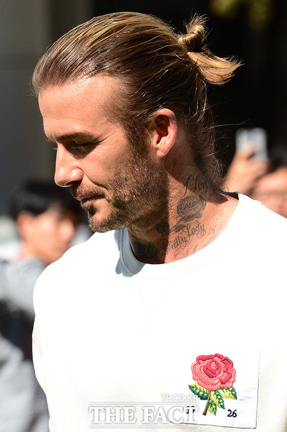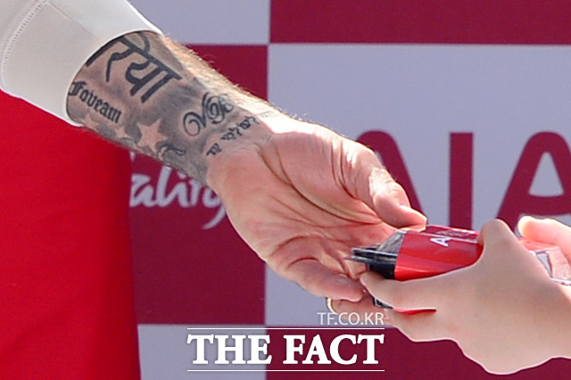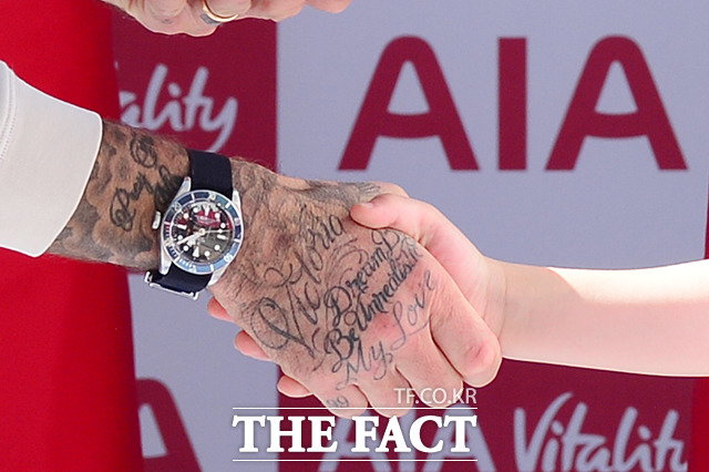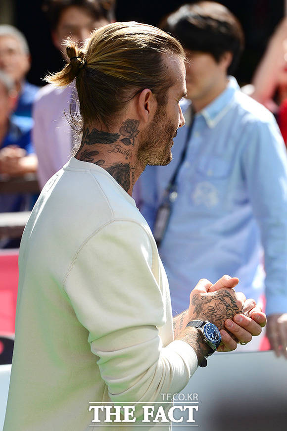 [더팩트ㅣ남용희 기자] 데이비드 베컴이 20일 오후 서울 종로구 청계광장에서 열린 'AIA 바이탈리티와 함께 걸어요' 사회공헌활동에 참가한 가운데 온몸의 타투가 눈에 띄고 있다.