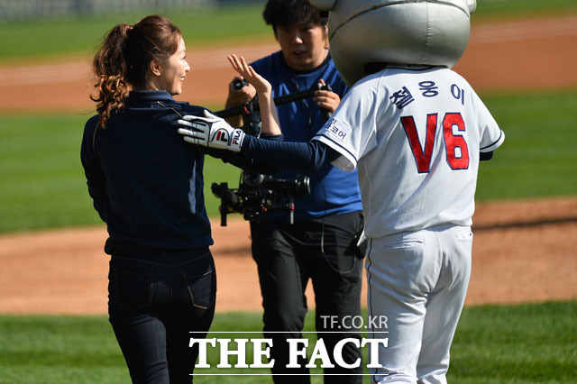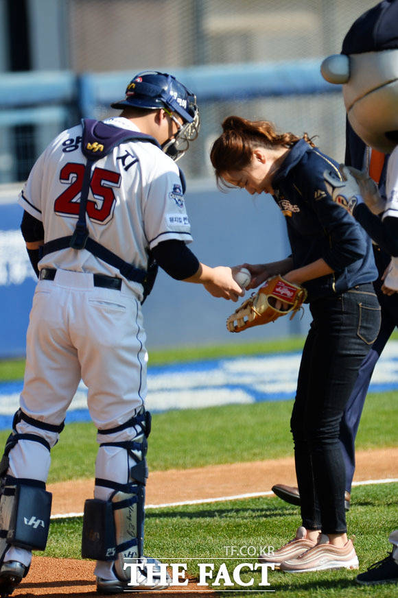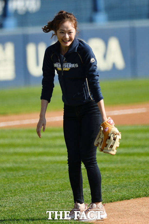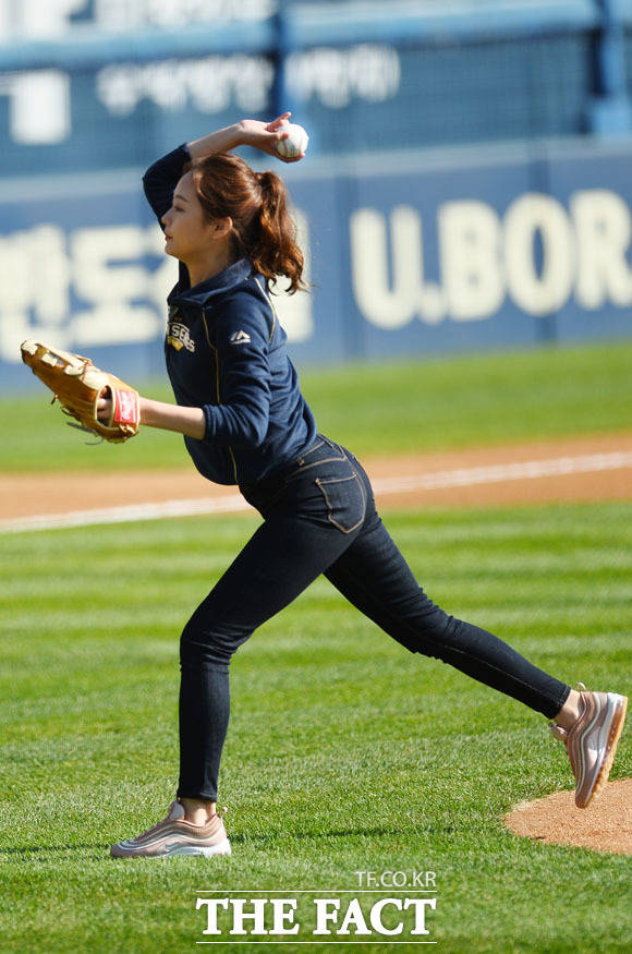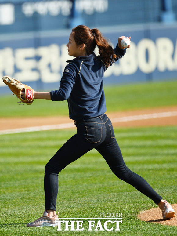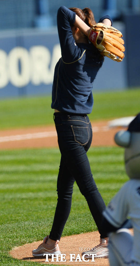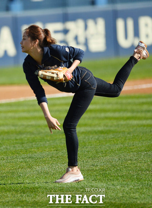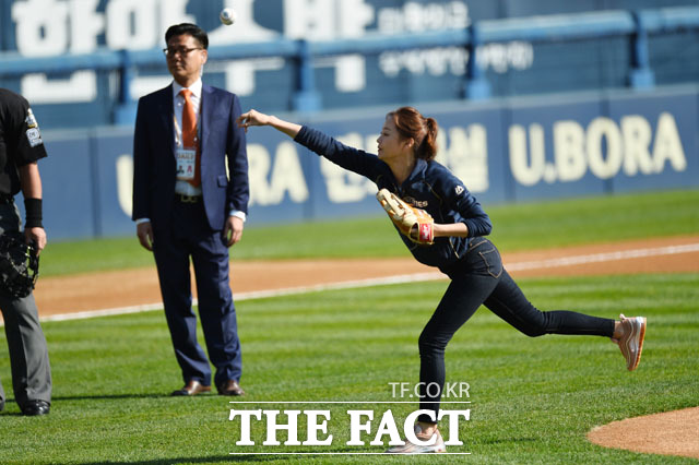 [더팩트 | 잠실야구장=남윤호 기자] 28일 오후 서울 송파구 잠실야구장에서 2017 KBO리그 한국시리즈 3차전 기아 타이거즈와 두산 베어스의 경기가 열린 가운데 배우 전소민이 시구를 하고 있다.