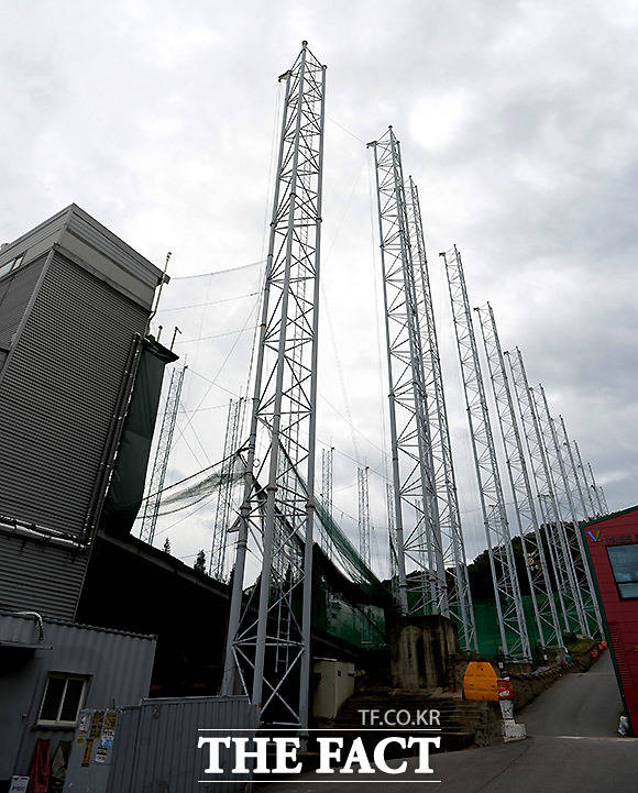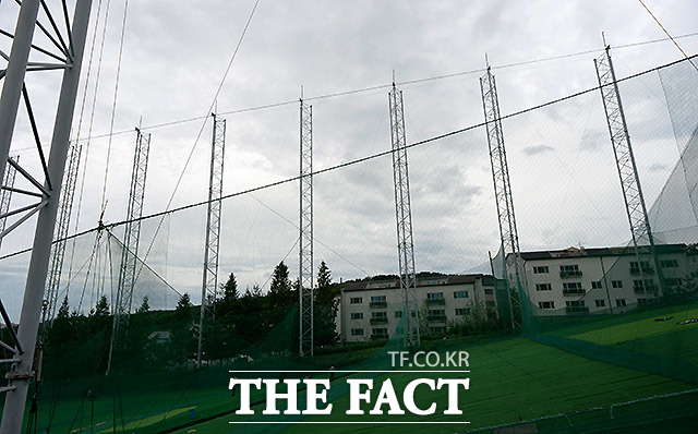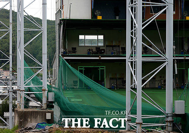 [TF포토] '태풍 피해 막아라' 그물망 내린 골프 연습장