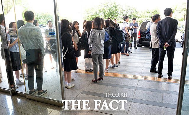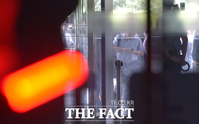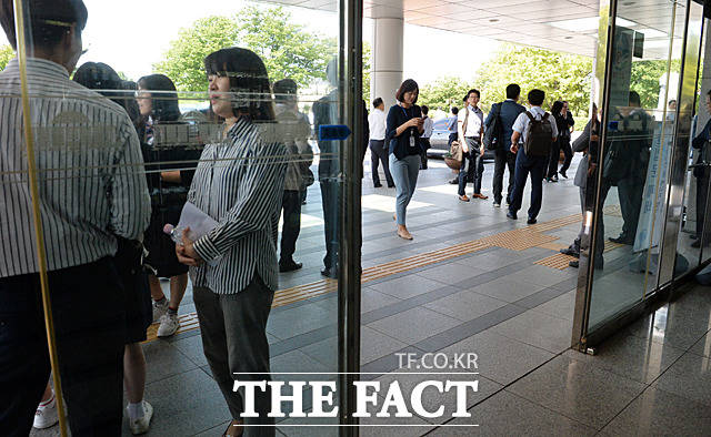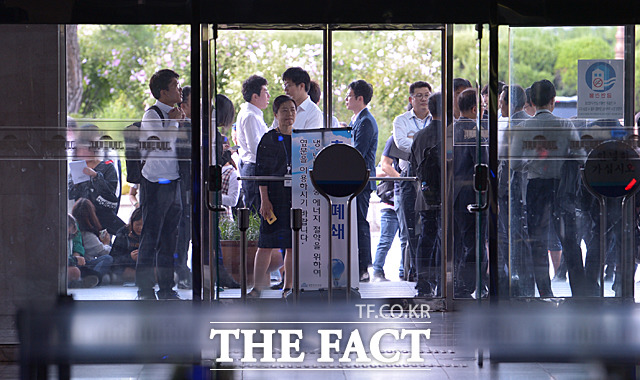 [더팩트ㅣ국회=문병희 기자] 전국적으로 지진대피 훈련이 실시된 12일 오후 서울 여의도 국회에서 국회 직원 및 참관인들이 건물 밖으로 대피하고 있다.