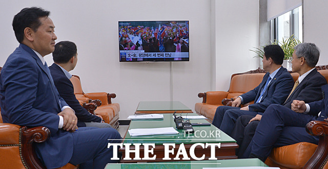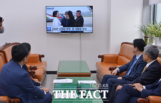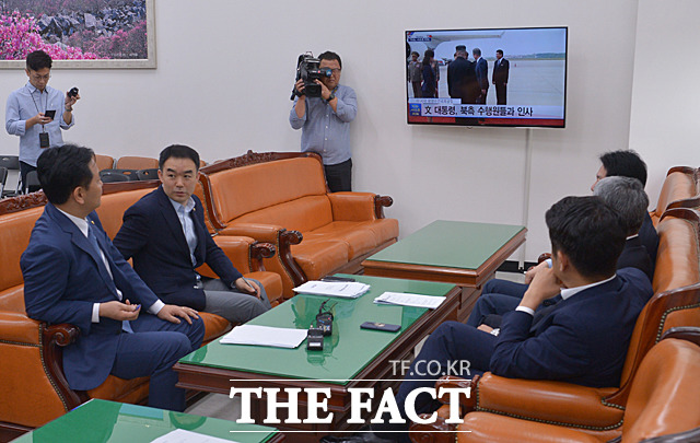 [더팩트ㅣ국회=문병희 기자] 김관영 바른미래당 원내대표 등 원내지도부가 18일 서울 여의도 국회에서 평양 남북정상회담을 시청하고 있다.