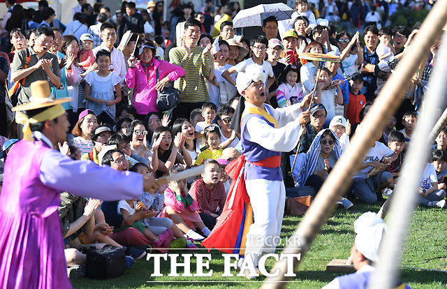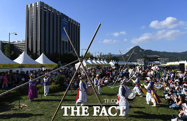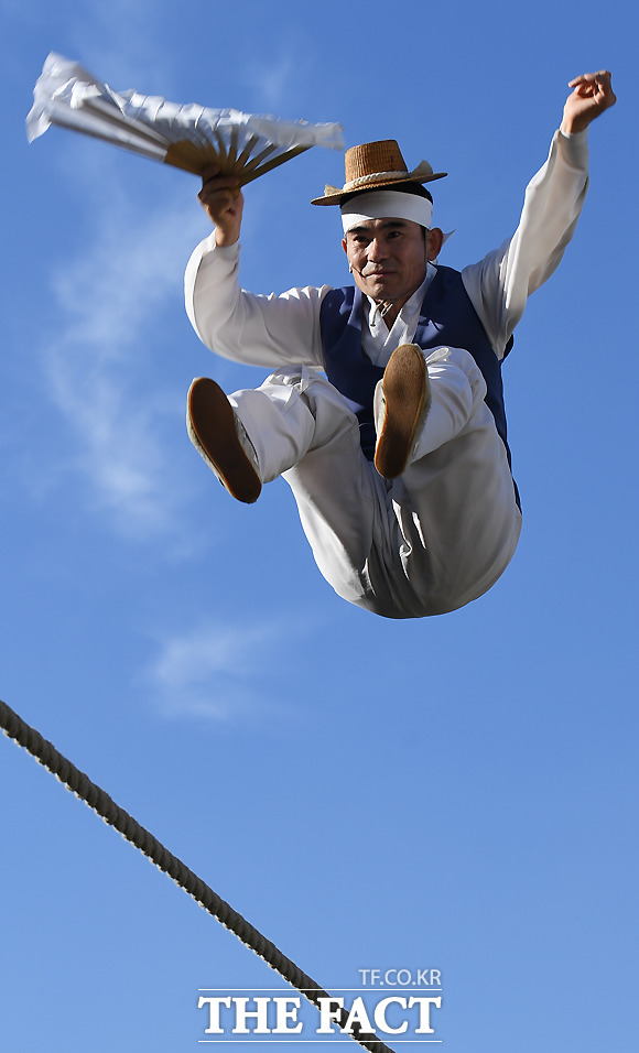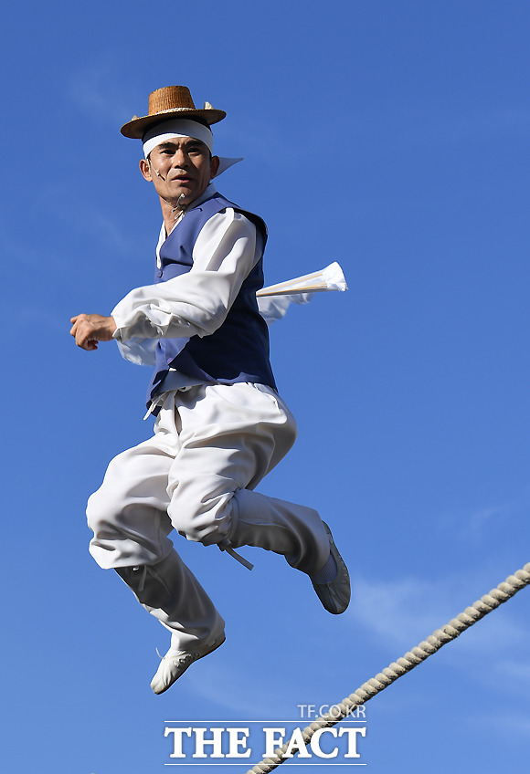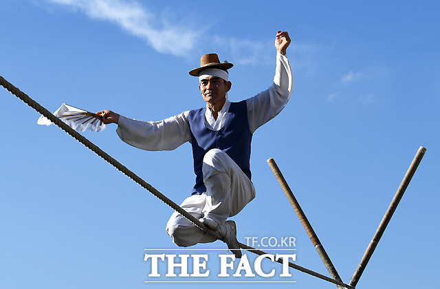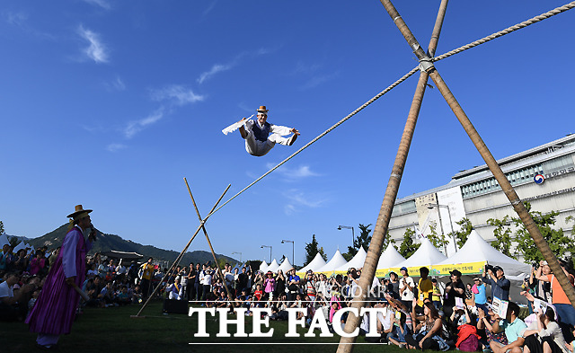 [더팩트ㅣ이새롬 기자] 추석 연휴 첫날인 22일 '2018 종로 한복축제'가 서울 종로구 광화문광장 잔디마당에서 열린 가운데 권원태 명인이 줄타기를 하고 있다.