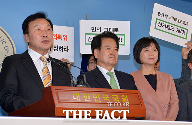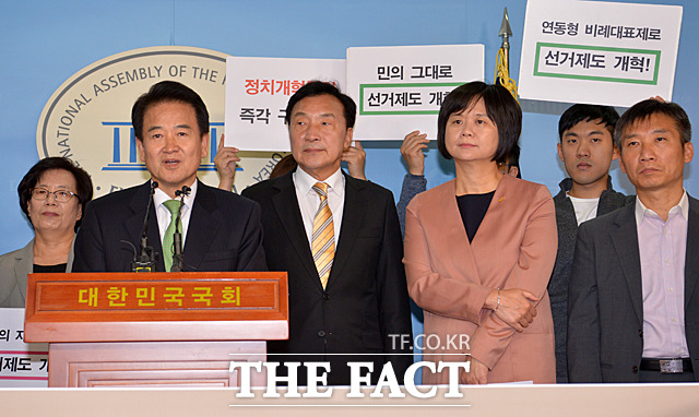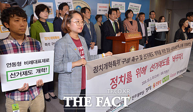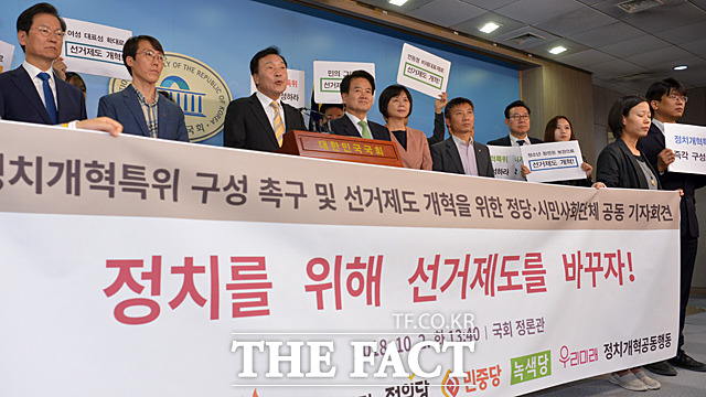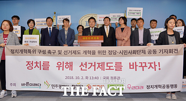 [더팩트ㅣ국회=문병희 기자] 정치개혁특위 구성 촉구 및 연내 선거제도 개혁 결의 정당·시민사회 공동기자회견이 2일 서울 여의도 국회 정론관에서 열린 가운데 이정미 정의당 대표, 손학규 바른미래당 대표, 정동영 민주평화당 대표(왼쪽부터)가 선거제도 개혁을 촉구하고 있다.