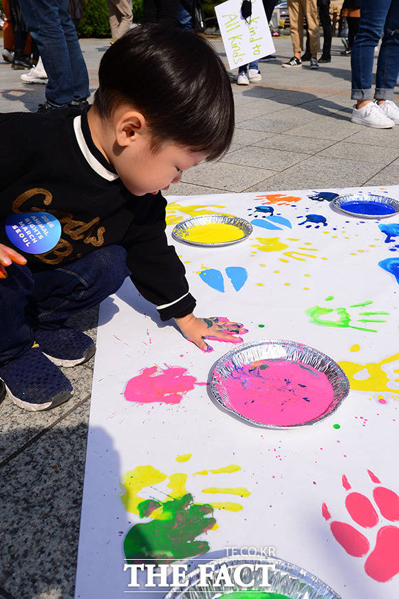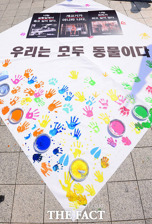 [더팩트ㅣ남용희 기자] 동물 관련 시민단체 동물해방물결의 '종차별 없는 세상을 향한 2018 동물권 행진 및 기자회견'이 14일 오전 서울 종로구 보신각 앞에서 열린 가운데 참가자들이 손도장을 찍는 퍼포먼스를 진행하고 있다.