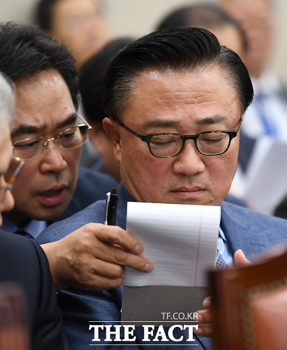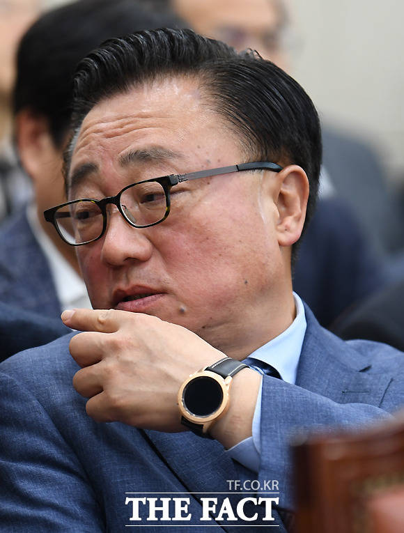 [더팩트ㅣ국회=이새롬 기자] 고동진 삼성전자 사장이 26일 서울 여의도 국회에서 열린 과학기술정보방송통신위원회의 종합국정감사에 증인으로 출석해 의원들의 질의를 들으며 안경을 고쳐쓰고 있다.