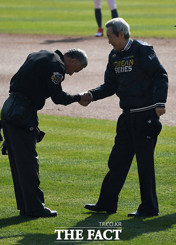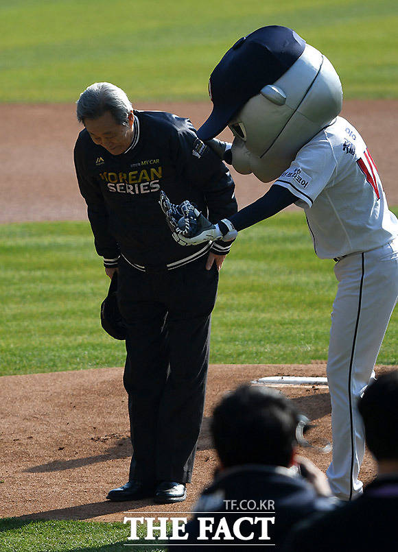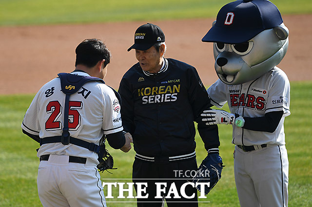 [더팩트ㅣ잠실야구장=이효균 기자] '2018 신한은행 마이카 KBO 한국시리즈 1차전' 두산 베어스-SK 와이번스의 경기가 4일 오후 서울 송파구 잠실야구장에서 열린 가운데 야구원로 어우홍 감독이 시구를 하고 있다.